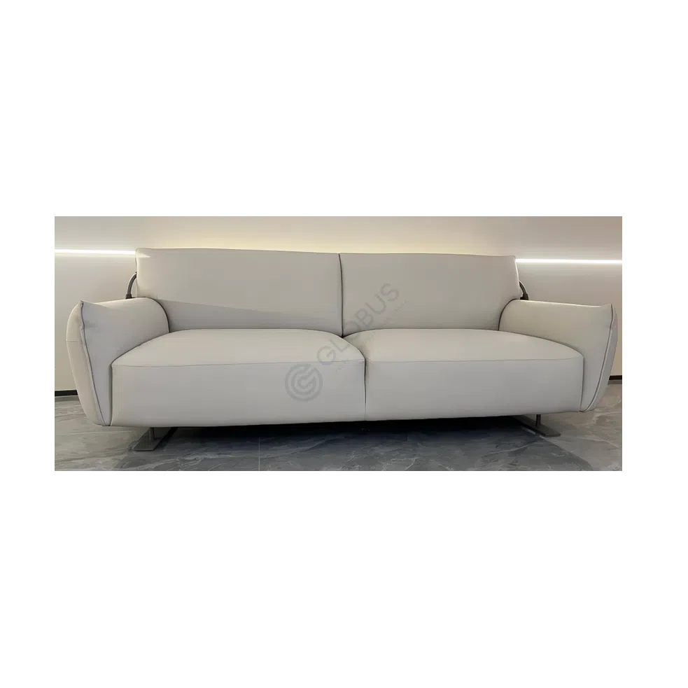 The headboard is generously padded, offering both comfort and a striking visual element. Upholstered in the same premium textile, its curved shape is complemented by a distinctive solid wood structure integrated on the sides, adding a unique detail and a touch of natural material contrast.