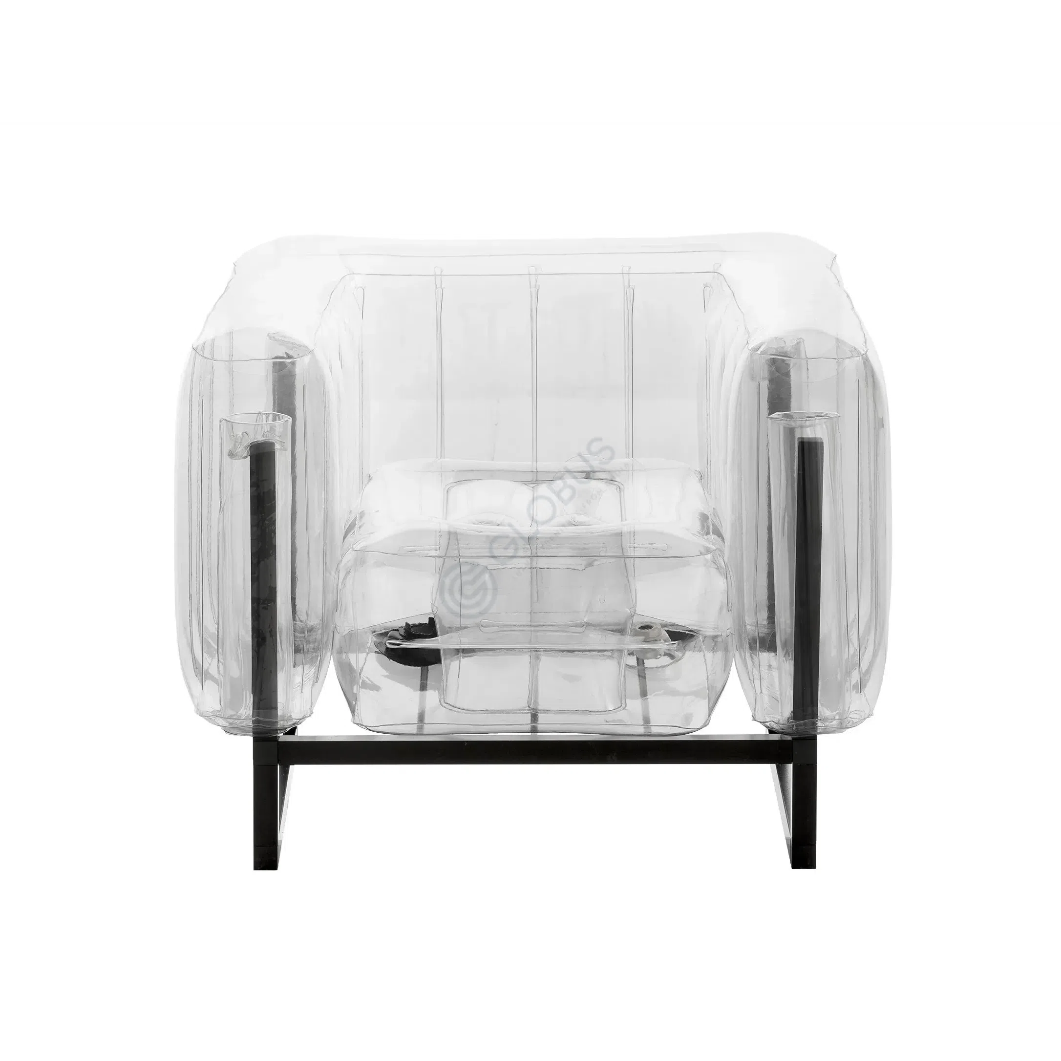 This pouf presents a modern aesthetic through a clever combination of materials. It features a sculptural, clear PVC seat set upon a geometric frame made from black metal. The transparency of the seat offers a unique visual element, creating a sense of lightness that complements the solid structure of the base.