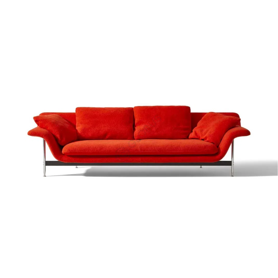 This modern armchair features a striking combination of a polished metal frame and vibrant, multi-colored textile upholstery. The linear structure provides a clean, contemporary silhouette, complemented by softly curved cushioning that brings both visual interest and supportive comfort. Slim metal legs give the piece a refined, airy presence, while the wood-accented armrests add a warm contrast and an inviting tactile touch.