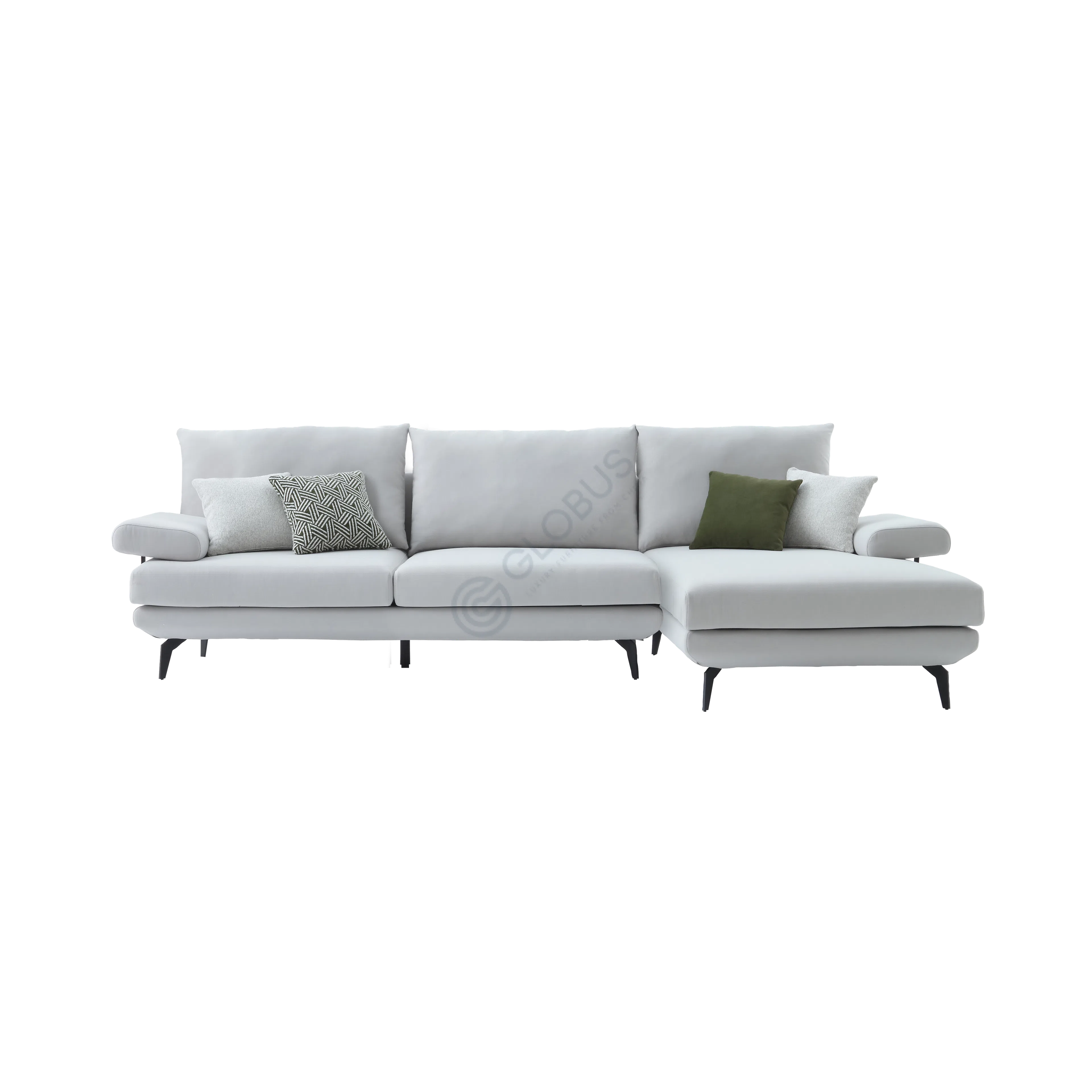 Crafted with a robust internal frame combining solid wood and plywood, this sofa is built for lasting durability. It is supported by sleek metal legs that elevate the piece, contributing to its refined aesthetic and modern style. The upholstery is a high-quality textile, chosen for both its visual appeal and comfortable texture.