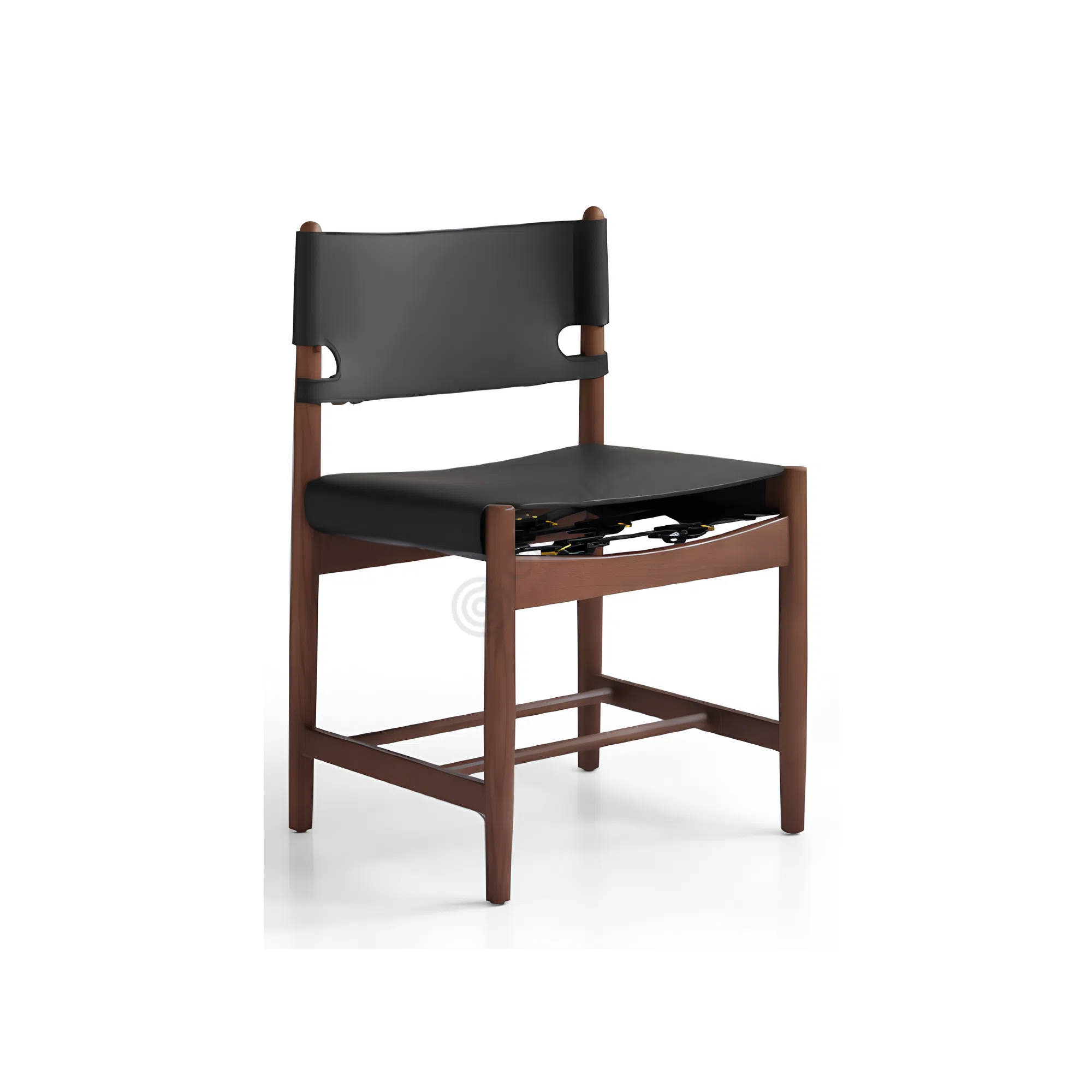 The frame is crafted from robust solid wood, providing a sturdy yet elegant foundation. The natural grain of the wood perfectly complements the rich, warm tone of the saddle leather that forms the seat and backrest. This saddle leather is selected for its exceptional durability and its ability to develop a unique patina over time, enhancing its character.