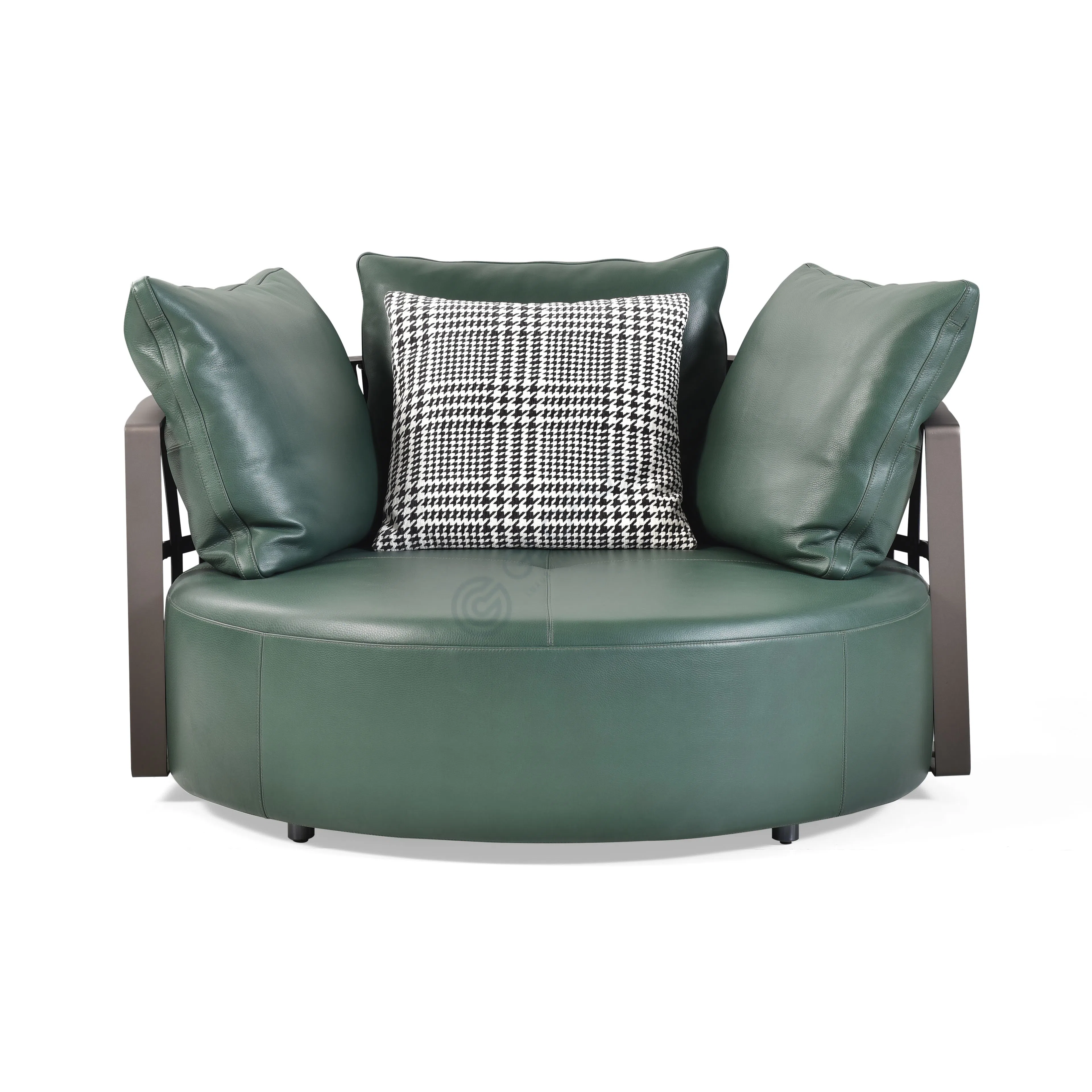 This sophisticated circular couch is crafted with a perfect blend of durability and comfort. Its solid wood frame ensures lasting stability, while the stainless steel accents add a modern and sleek touch. Upholstered in soft suede leather, it offers a luxurious feel and an inviting look, ideal for any contemporary living space. Generously padded cushions enhance relaxation, making it a stylish and cozy addition to your home.
