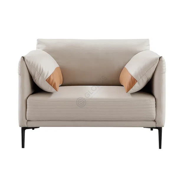 The design is elevated by slender metal legs that provide both sturdy support and a visually light footprint, allowing the sofa to feel airy within the space. The thoughtful details, such as the subtle accenting on the scatter cushions, enhance the refined aesthetic without overwhelming the minimalist appeal.