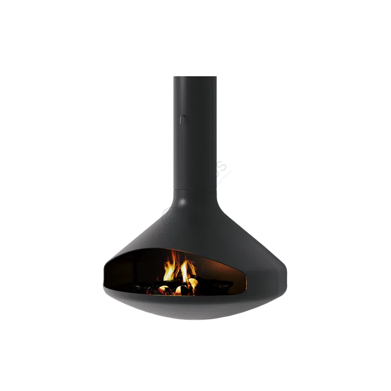 This modern hanging fireplace makes a striking design statement. Its smooth, spherical form is suspended from above, creating a captivating focal point that floats elegantly within the room.