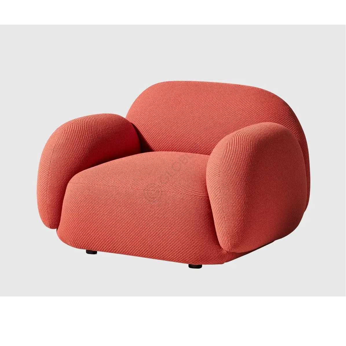 This sofa presents a contemporary form with soft, inviting curves that define its silhouette. The design features generous, rounded seat modules and gently sloping armrests, creating a look that is both modern and welcoming. Its clean lines and plush appearance make it a refined addition to any setting.