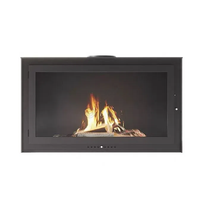 This fireplace insert presents a clean, modern design, featuring a substantial tempered glass pane framed by solid cast iron. Its rectangular form and dark finish create a streamlined appearance that integrates well with contemporary interior styles. The large viewing window offers an expansive perspective on the fire within, becoming a dynamic element in the room.