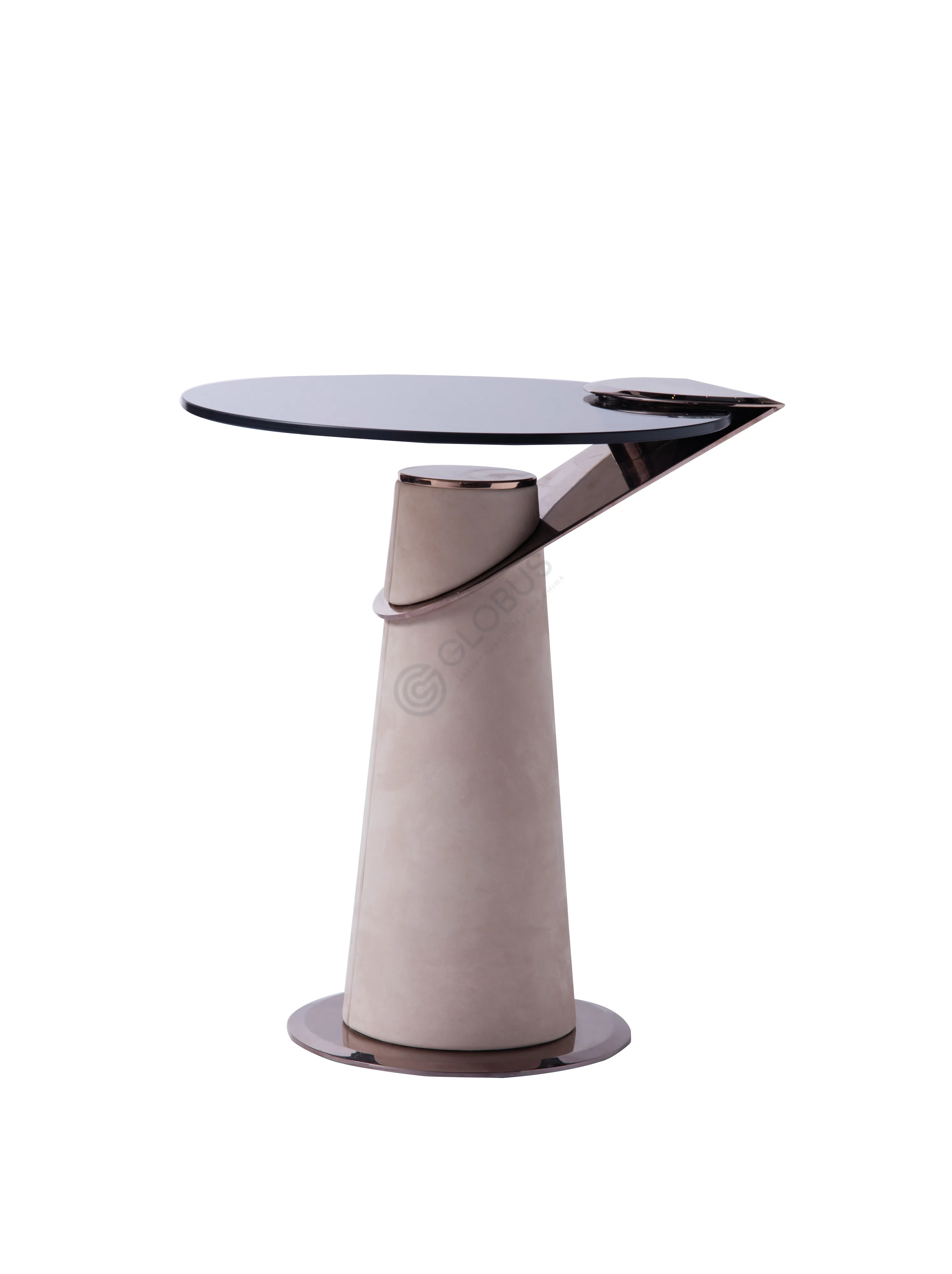 The chair is supported by a sturdy frame combining solid wood and plywood, with elegant legs providing reliable stability. The front legs are finished to match the upholstery, while the angled back legs feature a darker, contrasting finish, creating a dynamic visual balance. A detail of stainless steel might be incorporated in the structure for reinforcement or accent.
