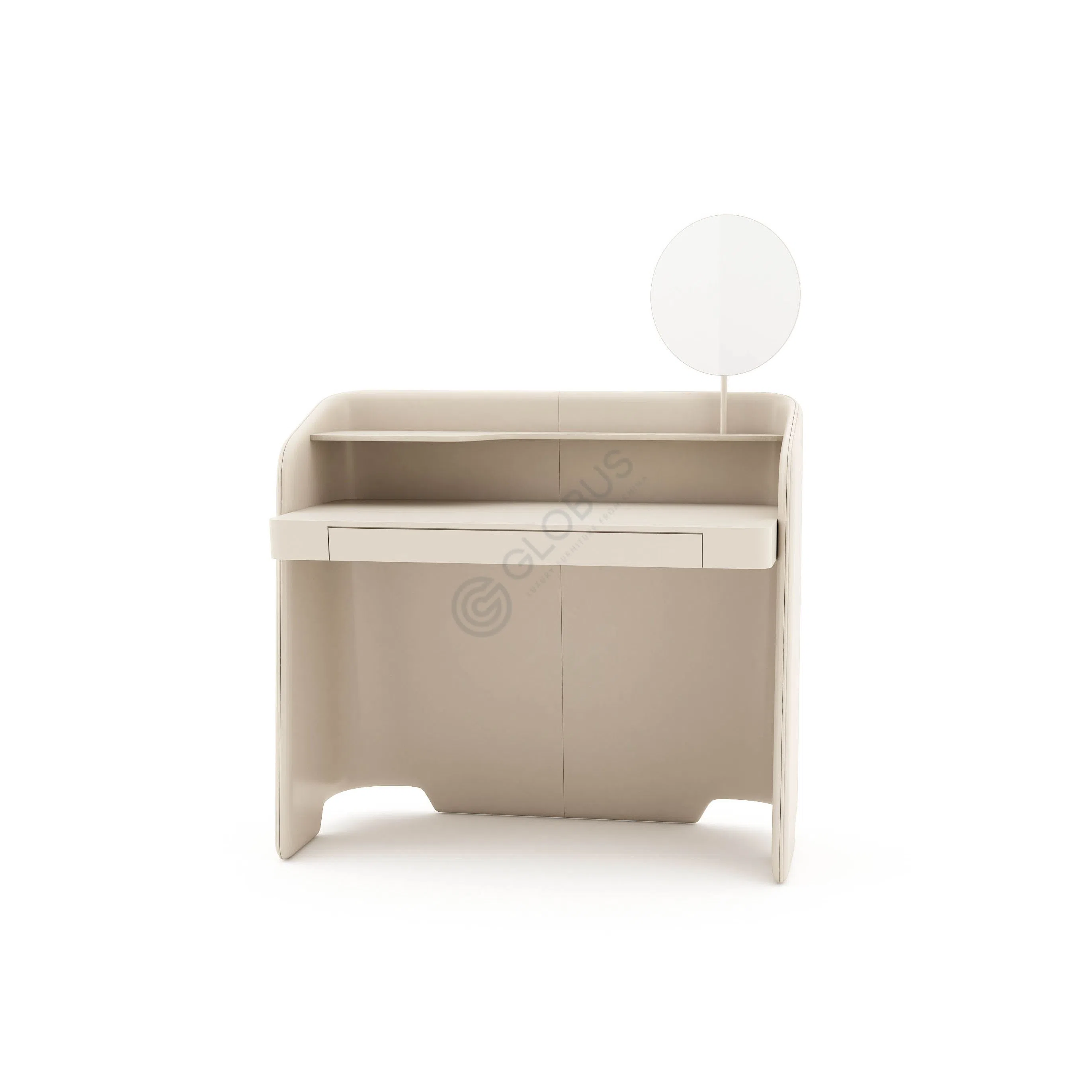 This modern bedside table features a streamlined silhouette and smooth contours, seamlessly blending into a contemporary bedroom setting. The exterior is upholstered in eco saddle microfiber, offering a refined look with a soft, matte finish that is pleasant to the touch. Complementing the neutral tone of the upholstery, the black MDF frame provides a subtle contrast that highlights the minimalist design.