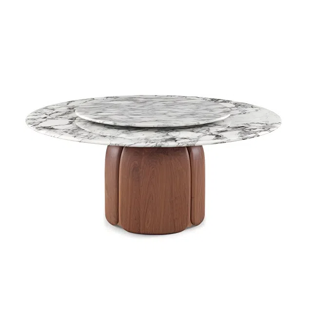 This coffee table features a distinctive form, blending robust materials with a refined silhouette. The base is crafted from solid wood, presenting a structured, rounded shape that gently expands towards the top. This substantial lower section supports a beautiful, smooth surface made from natural marble, showcasing its unique veining and luxurious texture. Subtle details, potentially in stainless steel, accent the joinery, adding a touch of modern elegance.