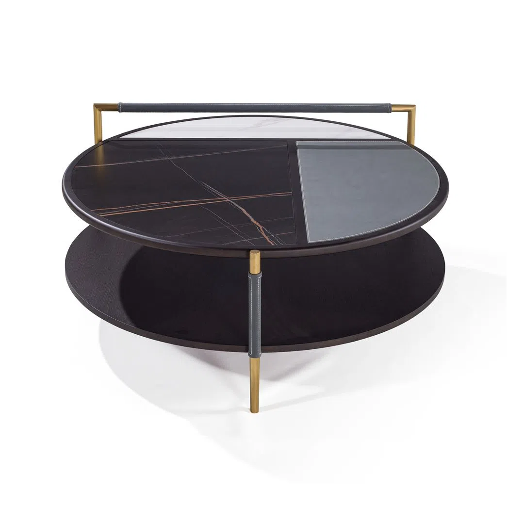 Crafted from a thoughtful selection of premium materials, the table features a sturdy structure combining solid wood and stainless steel elements. The upright supports are elegantly wrapped in leather, adding a subtle layer of texture and luxury. The top surface is a sophisticated composition, incorporating sintered stone inserts that create a unique and visually interesting pattern.