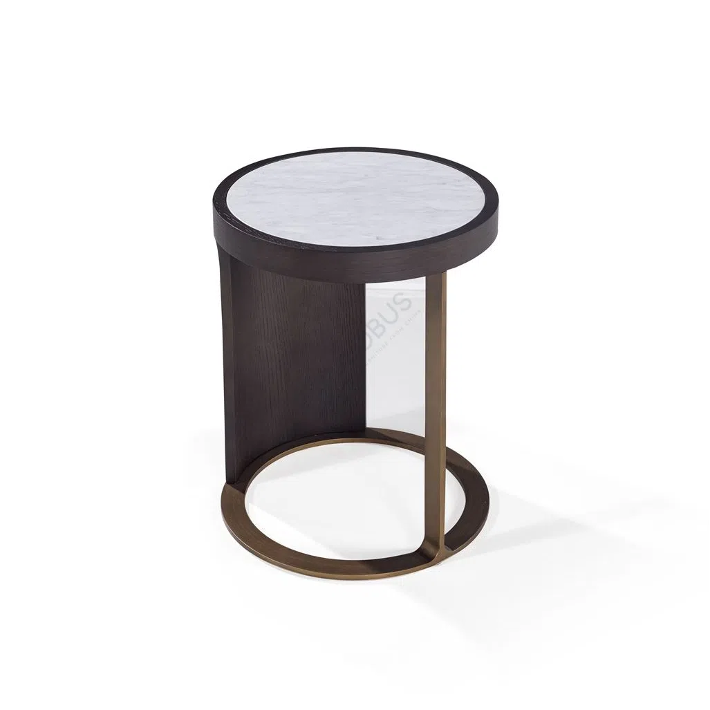 The marble is carefully cradled by a structure of solid wood, stained to a rich hue that adds depth and warmth to any living environment. This durable wooden frame is not only a testament to traditional craftsmanship but also showcases a modern sensibility with its clean, graceful curves.