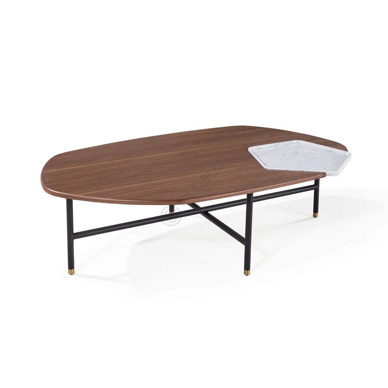 The top is supported by a minimalist metal frame with four slender legs, finished in a dark tone. Subtle metallic accents at the base of the legs add a touch of detail. Designed for the living room, this piece provides a stylish and functional surface beside seating, highlighting a sophisticated mix of solid wood, natural marble, and metal.