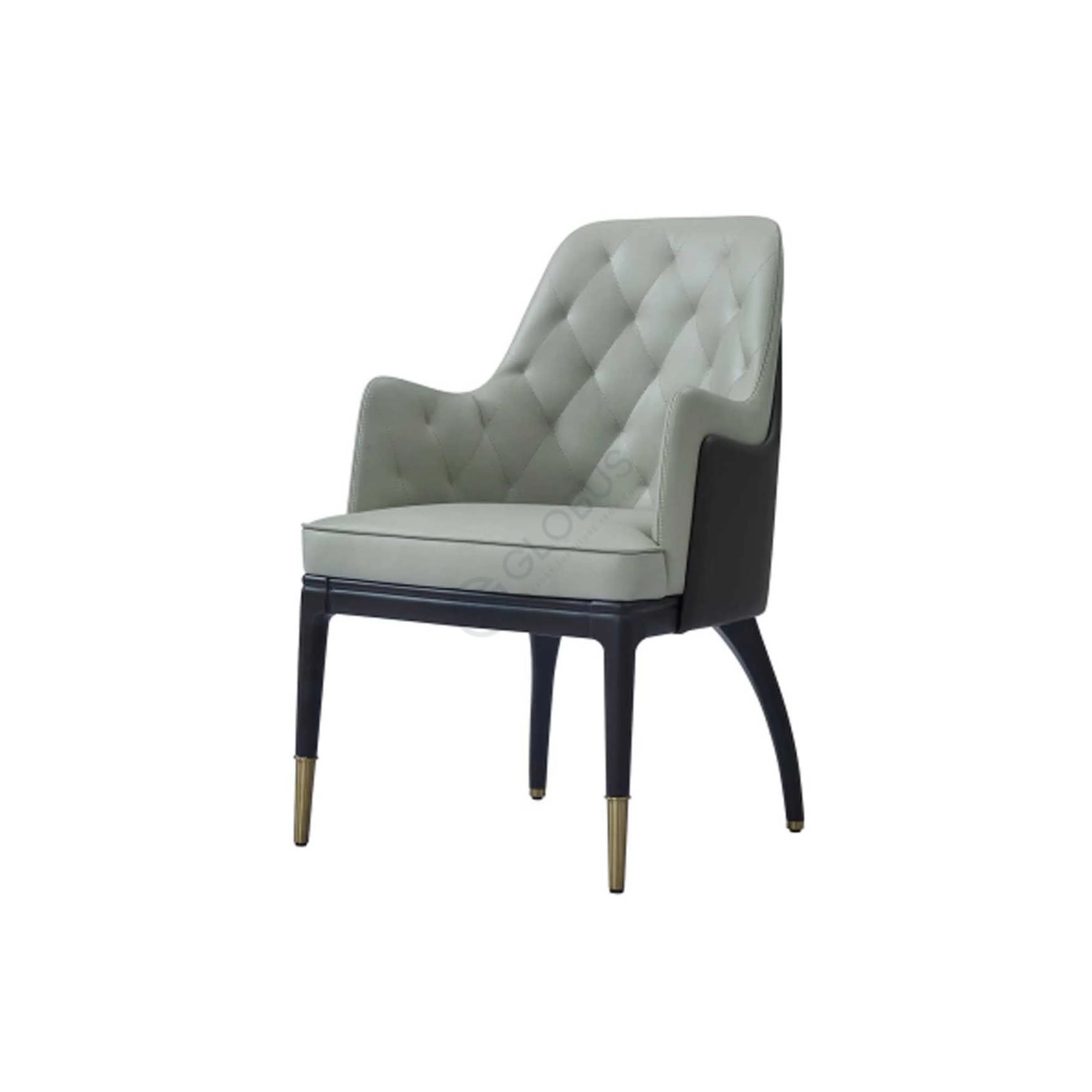 Contrasting dark panels elegantly wrap around the sides and base, defining the chair's clean lines. Tapered legs support the frame, finished with striking golden caps crafted from stainless steel. This subtle metallic accent enhances the chair's contemporary appeal.
