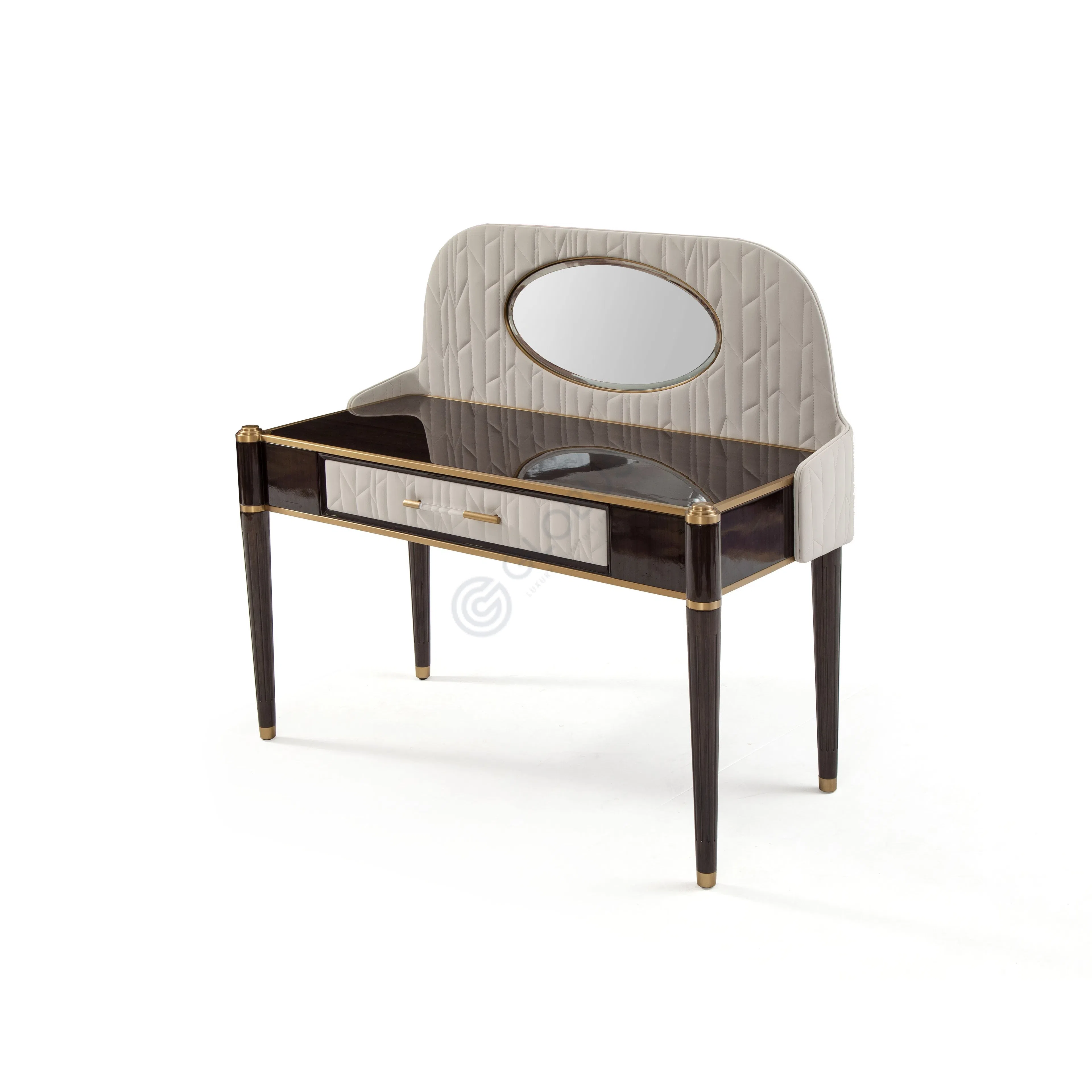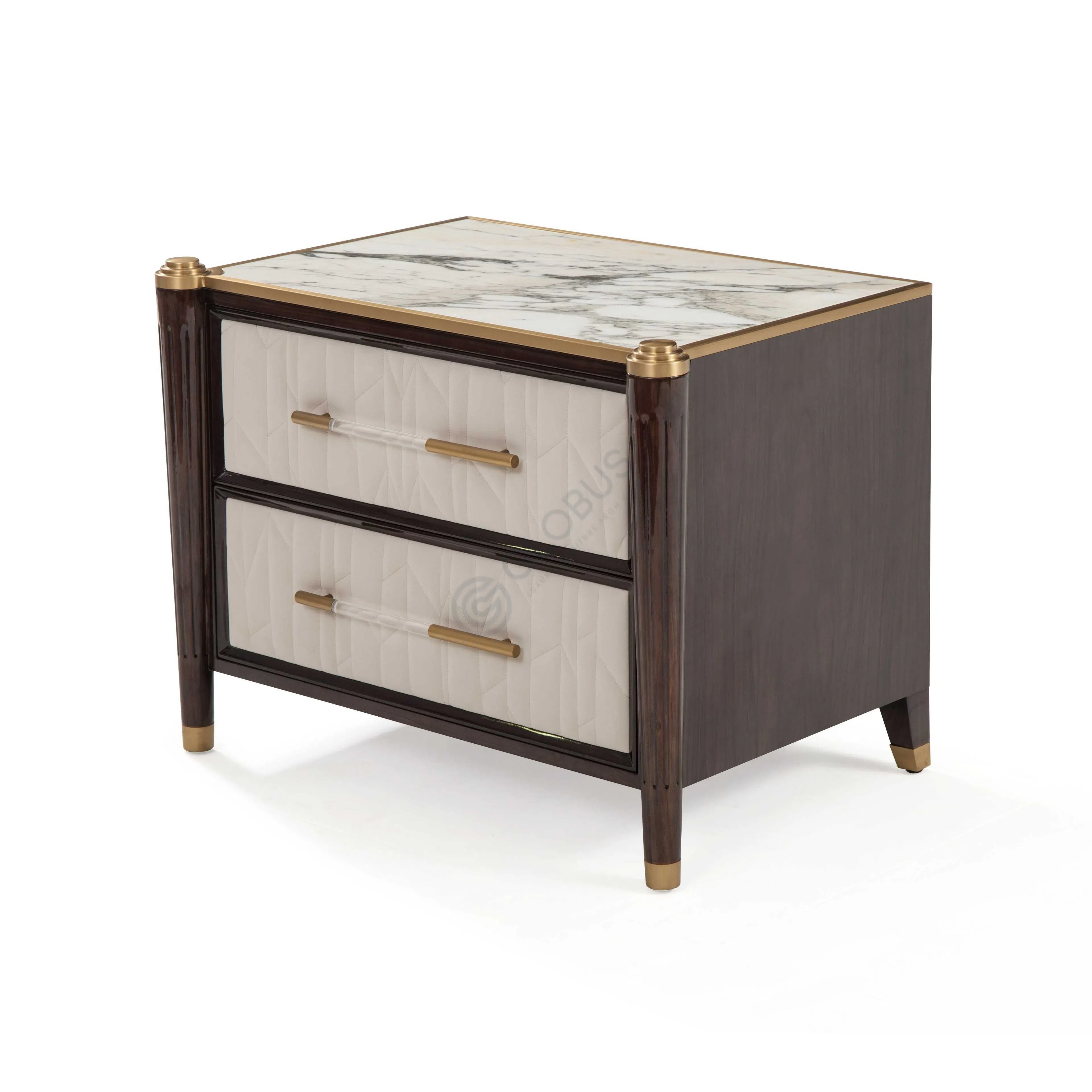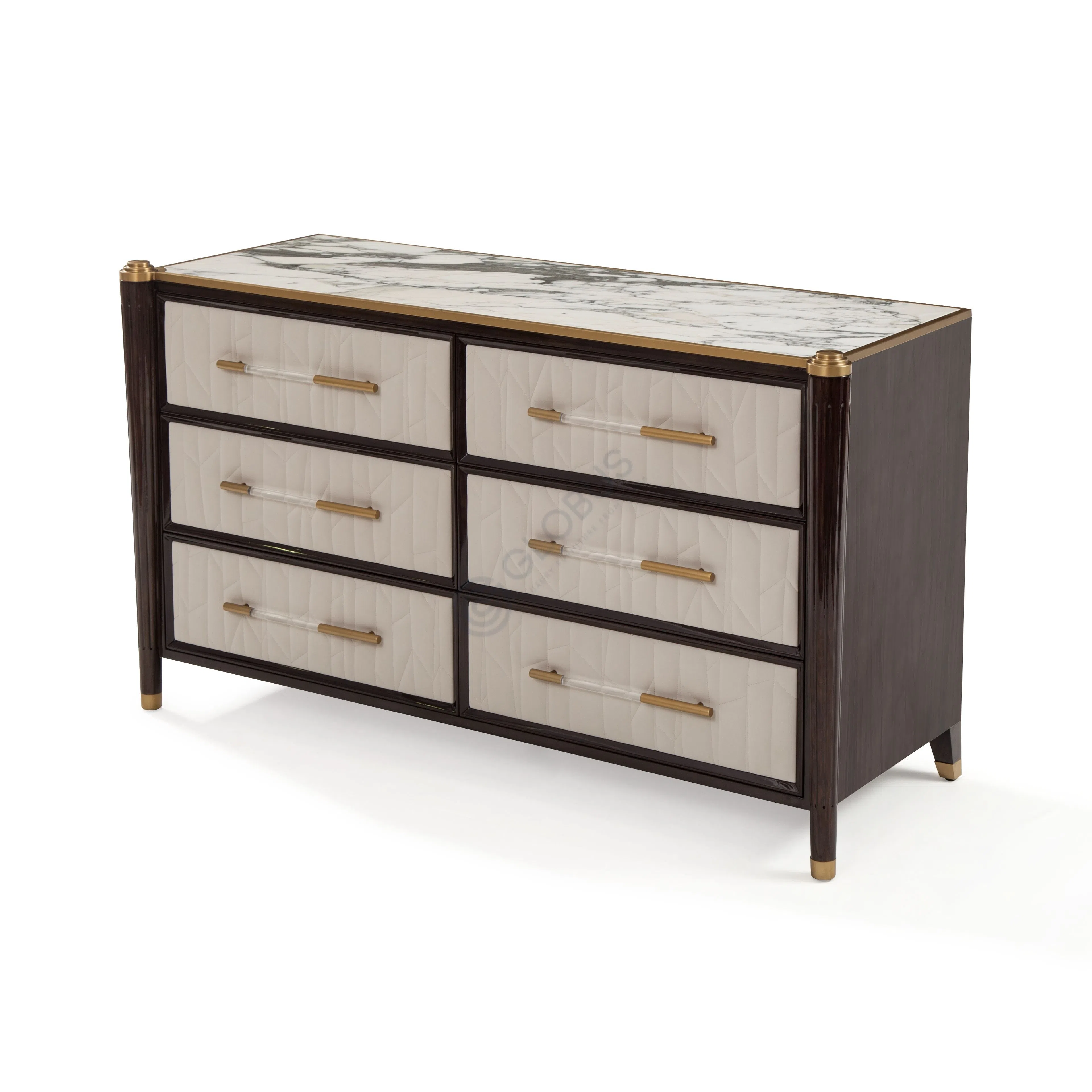 Elegant details highlight the design, with subtle touches of polished stainless steel used for accents and slender legs. The drawer fronts are finished with soft microfiber leather, offering a contrasting texture and a refined appearance. Sleek handles complete the look of the practical storage drawers.