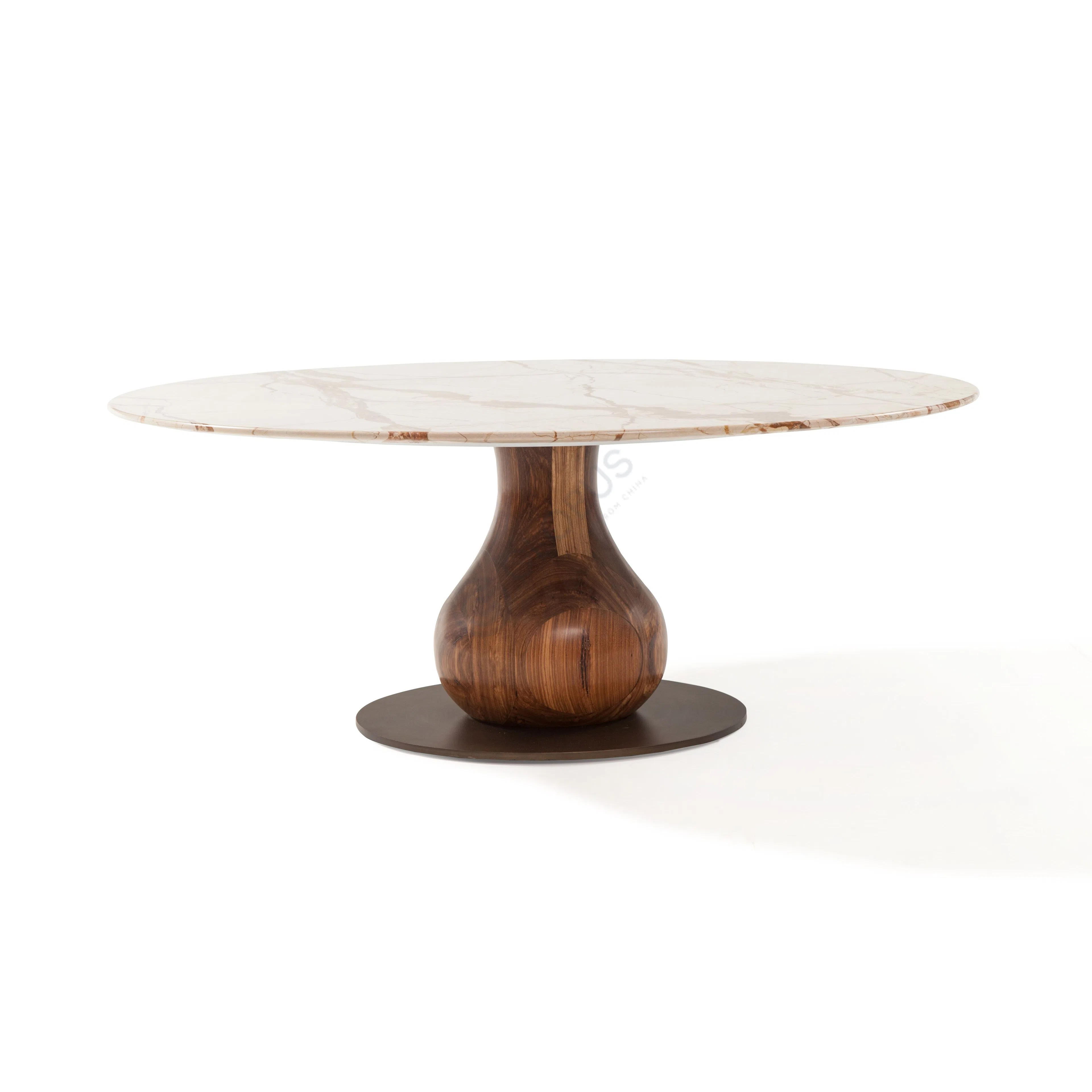 Supporting the marble is a beautifully shaped solid wood base. Its curved, sculptural form adds warmth and organic elegance to the piece, highlighting the rich grain of the wood. A subtle metal detail grounds the base, providing stability and a touch of modern contrast.