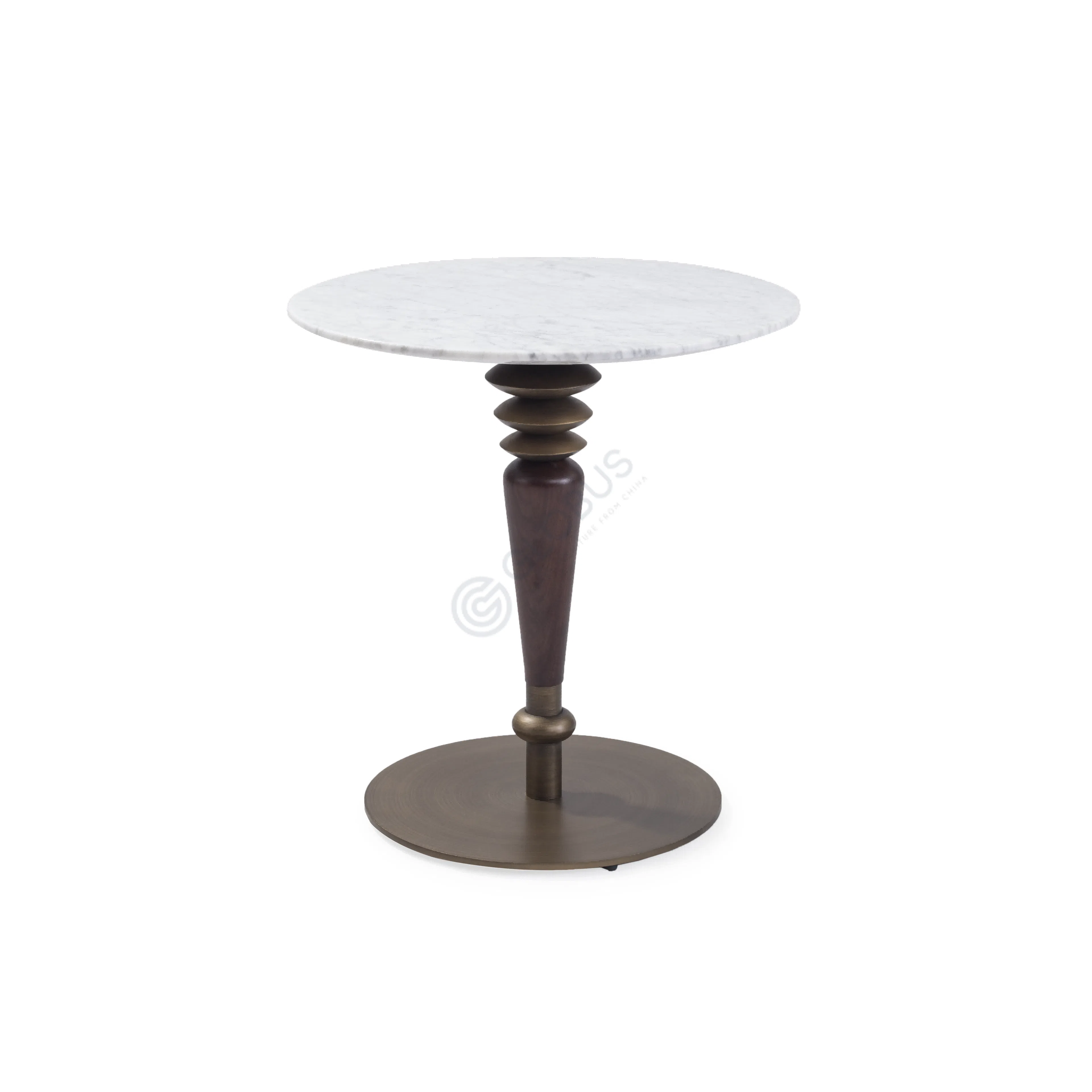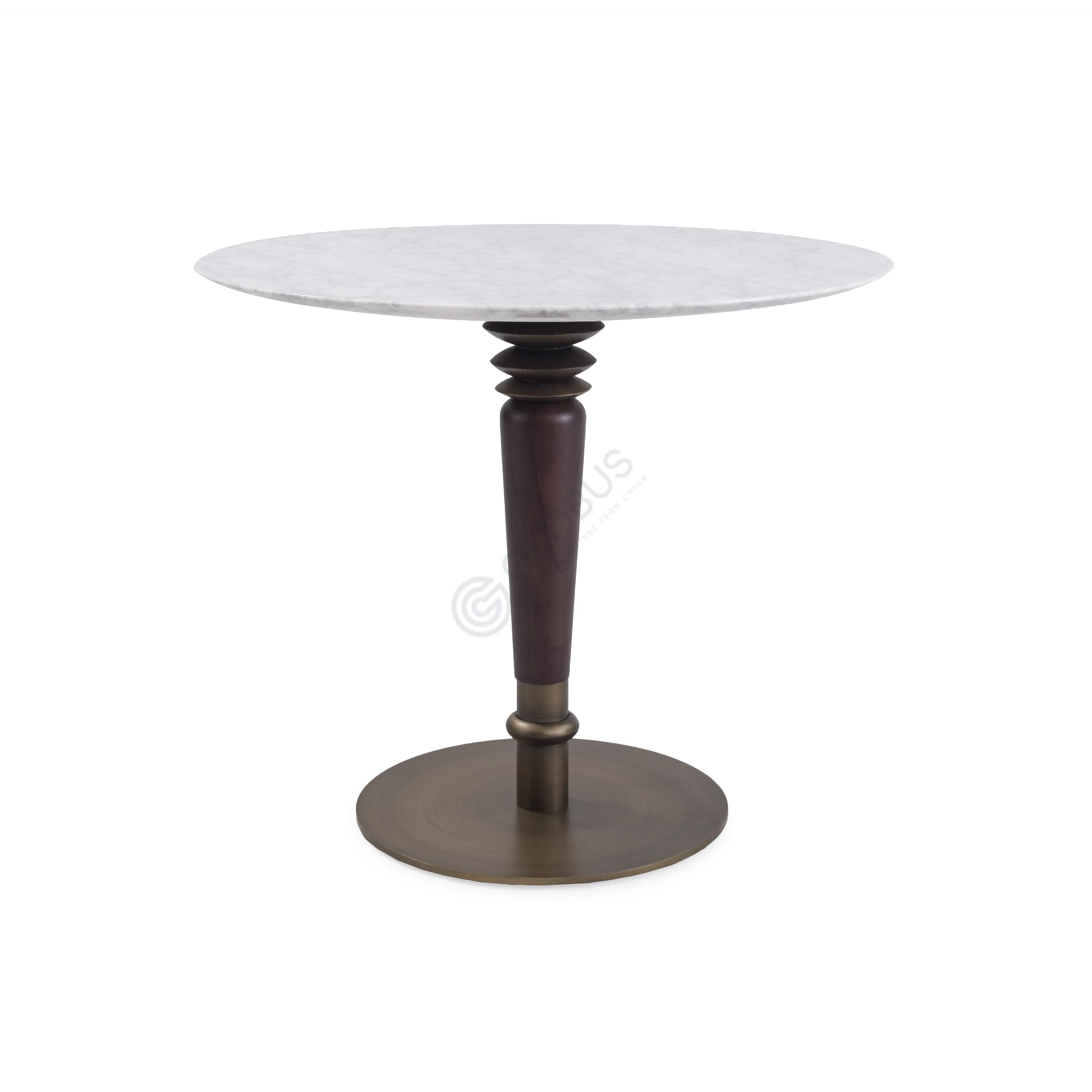 The table's robust support is engineered from solid wood, culminating in a slender yet sturdy central column that adds a touch of timeless elegance to the overall design. Ensuring stability and a grounded presence, a sleek metal base finished in a matte tone pairs harmoniously with the natural elements used throughout.