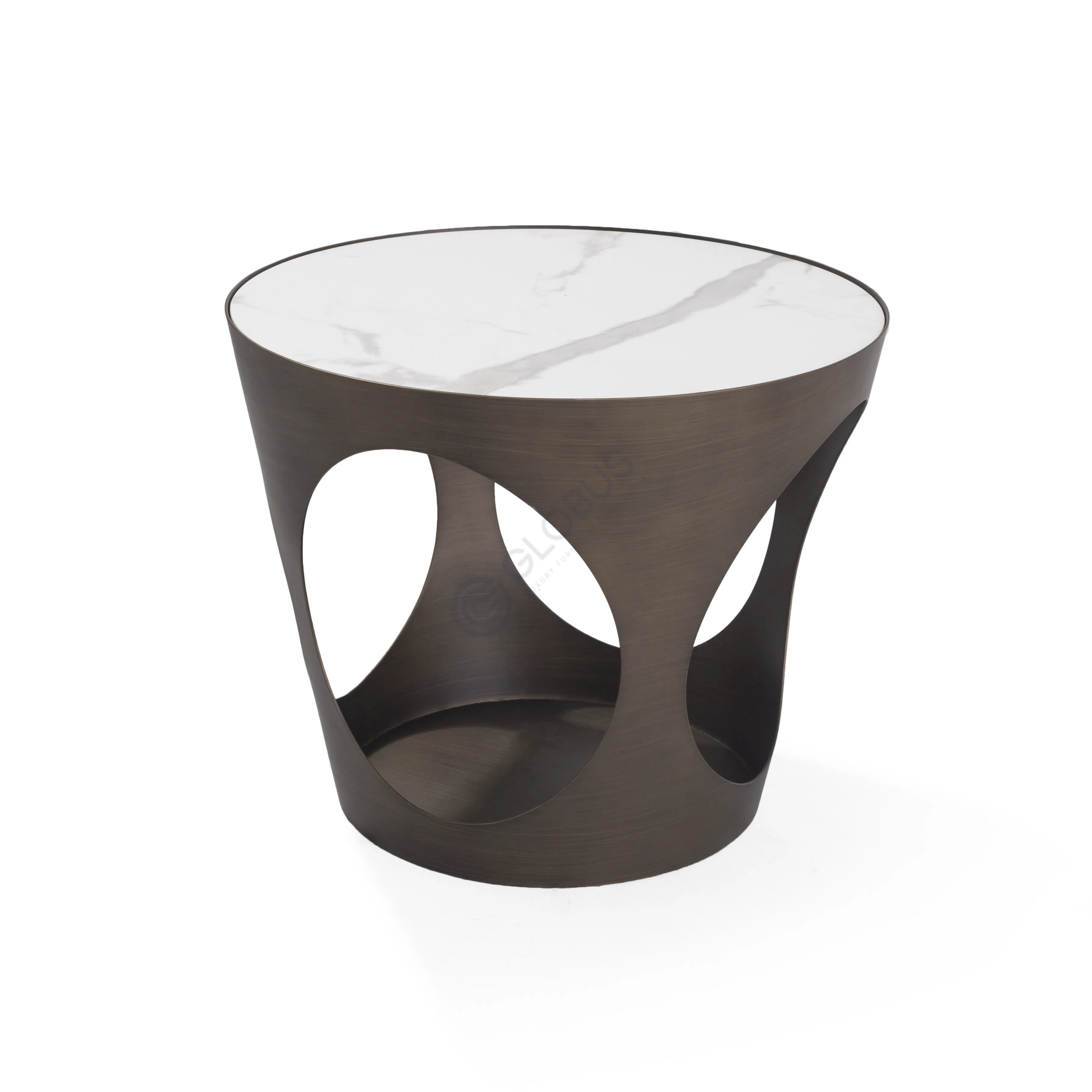 The tabletop is made from premium sintered stone, presenting a beautiful surface with subtle, natural-looking veining. This material provides durability and resistance, alongside a refined aesthetic that elevates the table's overall look.
