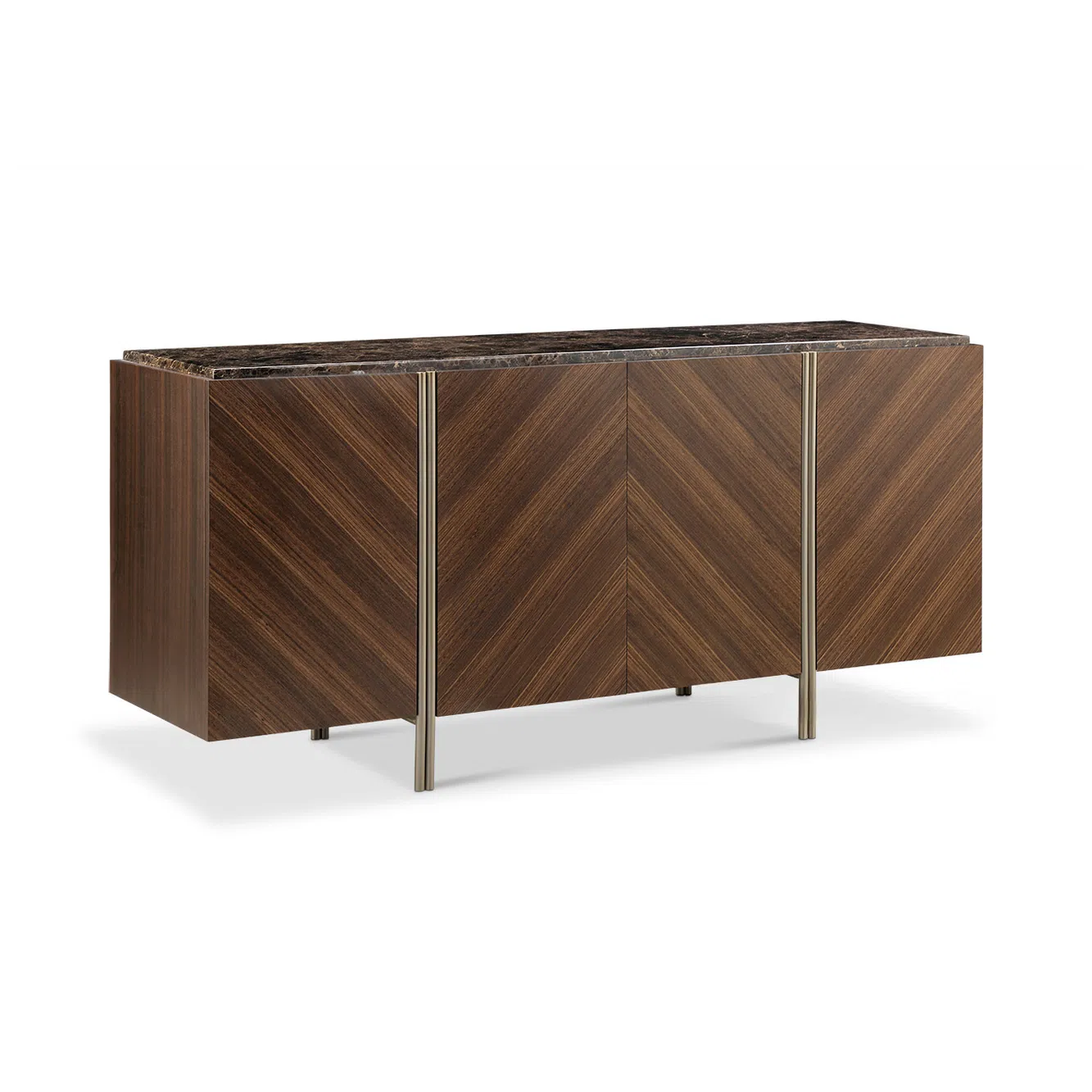A low, elongated TV stand with clean geometry and a refined mix of materials. The dark natural marble top introduces subtle veining, while chevron-matched natural veneer fronts bring warmth and movement. Slender vertical legs and trims in brushed stainless steel give a light, modern stance.
