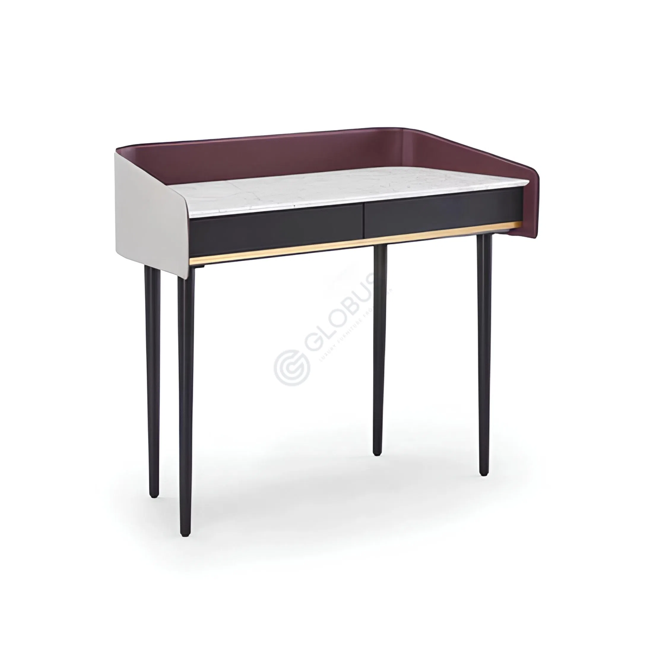 The desk is topped with a striking slab of sintered stone, showcasing a beautiful natural vein pattern that provides both visual appeal and a durable work surface. A subtle line of stainless steel trim runs just below the stone, adding a touch of refined detail and highlighting the integrated drawers designed to maintain clean lines.