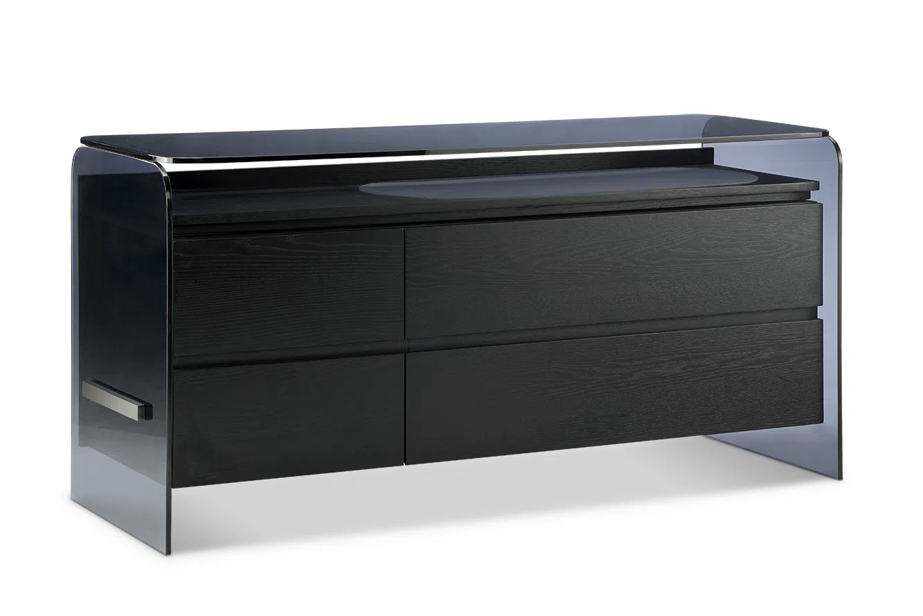 This modern bedside table presents a sophisticated form defined by clear lines and refined materials. Its structure is primarily composed of tempered glass with a subtle smoked tint, creating a look that is both contemporary and visually light. The glass sides curve gently at the top corners, leading into a flat upper surface.