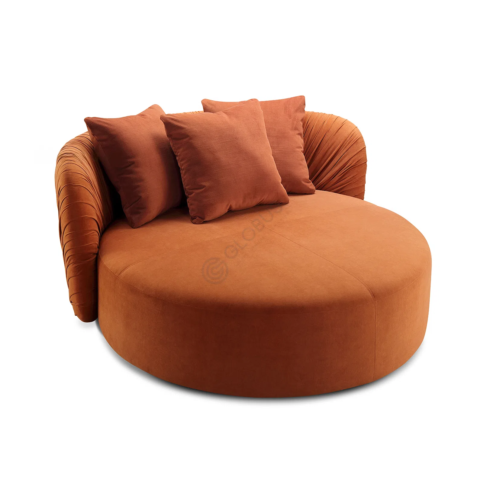 This armchair presents a sophisticated modern form. Its soft textile upholstery is characterized by a unique pleated design that flows gracefully along the curved backrest and arms, adding a layer of visual texture and depth. The generous seating area provides a comfortable, inviting space to relax.