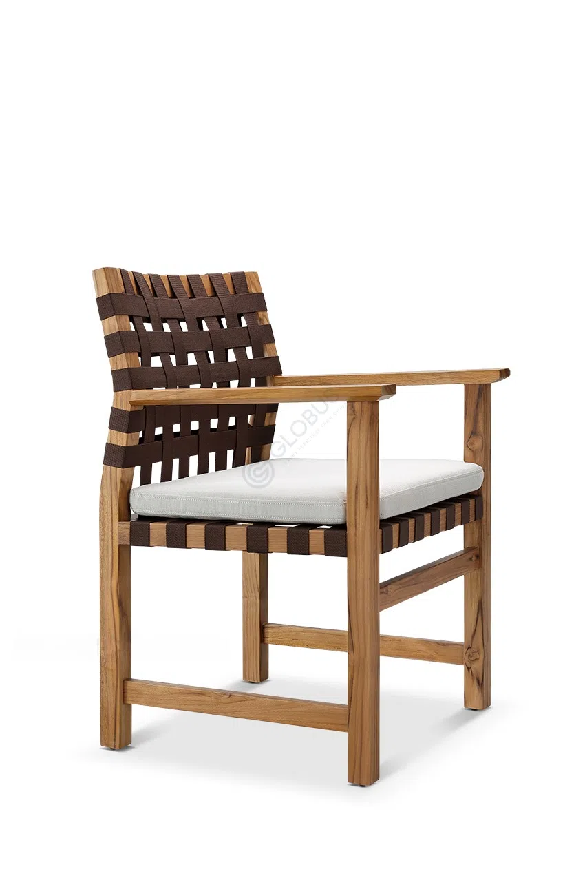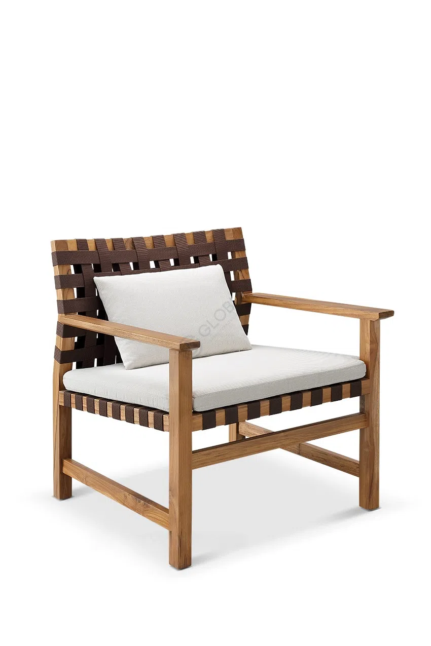 Crafted for outdoor living, the wood is finished for durability, and the textile covers are easy to care for. The design feels refined yet approachable, making it a natural fit for a garden lounge, a shaded terrace, or a poolside seating area.