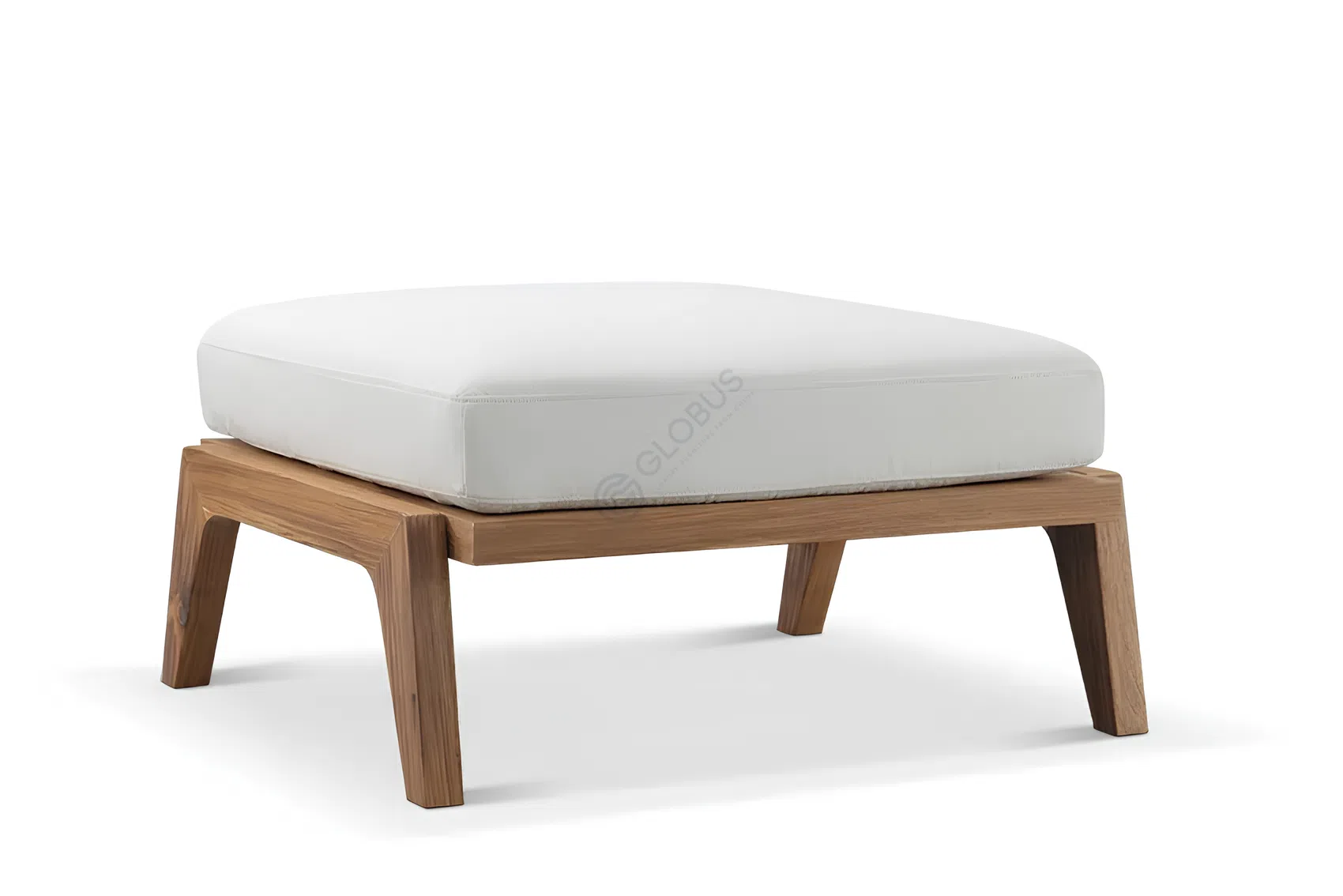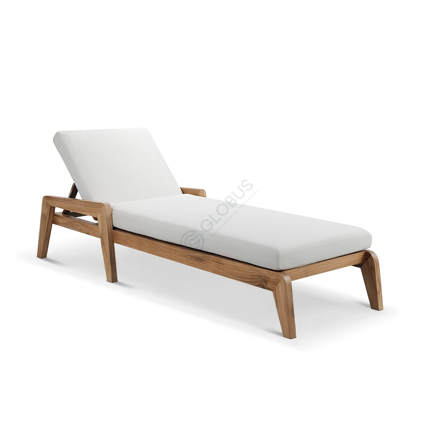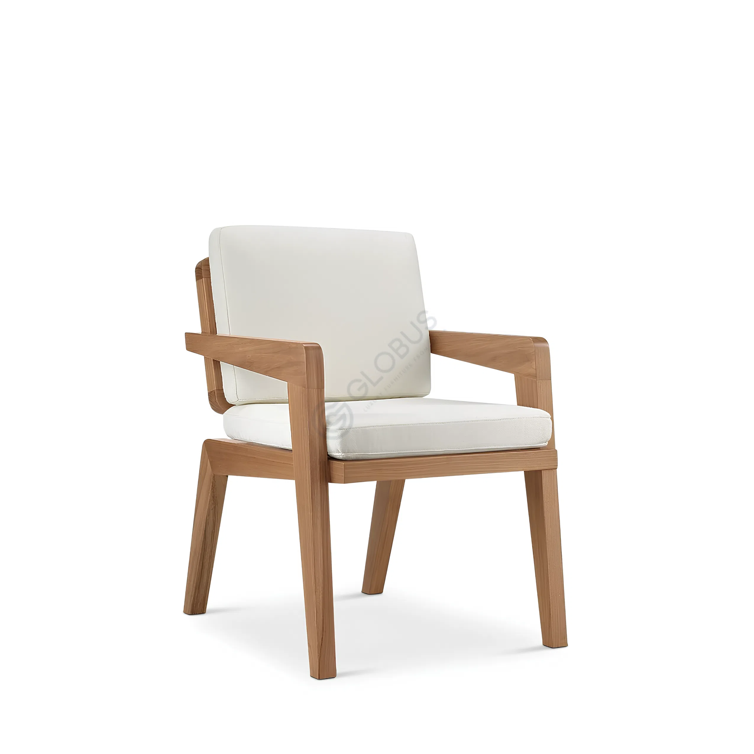 A modern outdoor armchair with a solid wood frame and soft textile cushions. The clean silhouette, warm grain, and light upholstery create a calm, contemporary look that fits a garden, terrace, or poolside lounge.