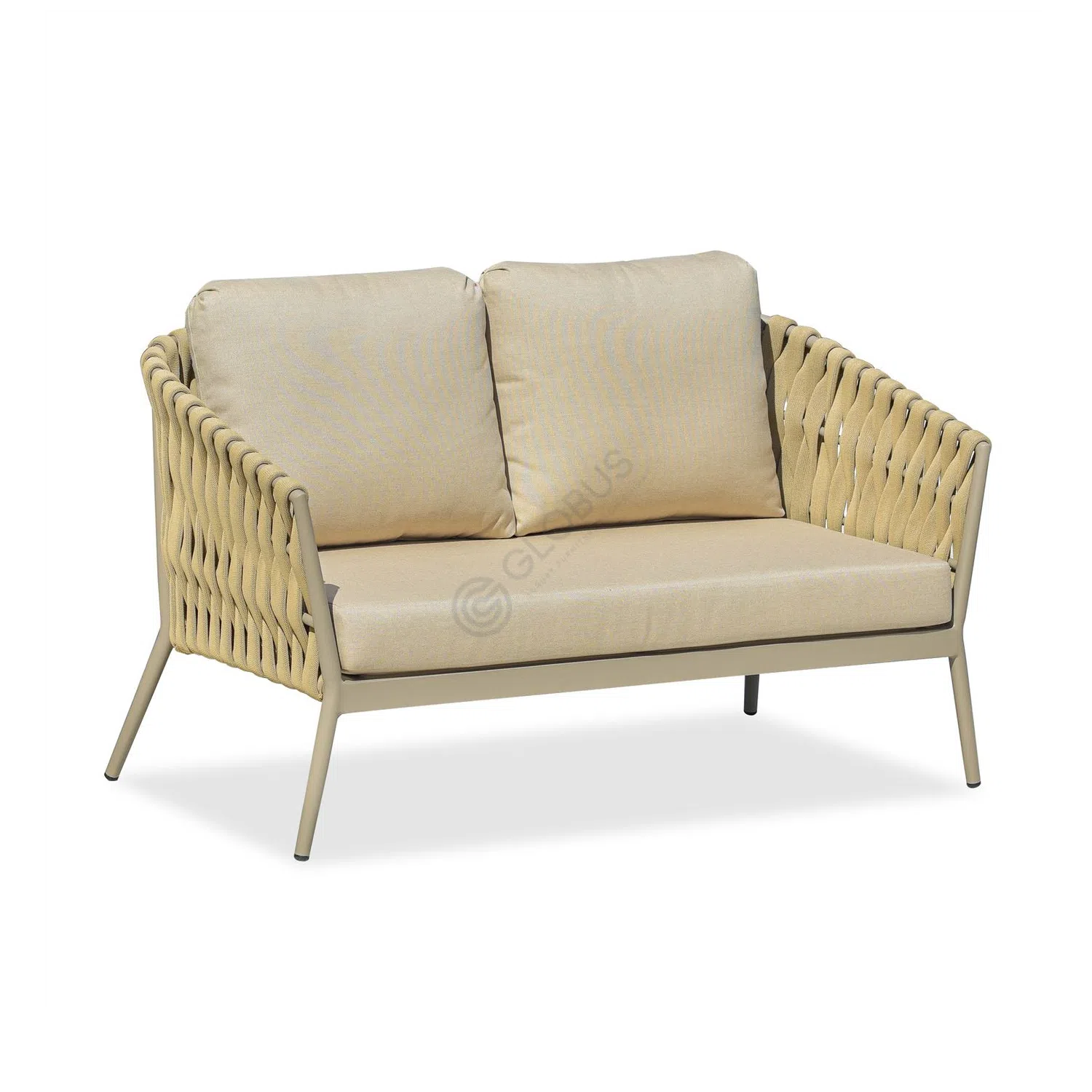 The distinctive design features a carefully braided ribbon forming the supportive back and sides, offering both visual interest and a unique texture. This is paired with a slender yet robust aluminum frame, providing a modern foundation and lasting durability suitable for outdoor environments. Plush textile cushions complete the seat, inviting you to settle in comfortably.