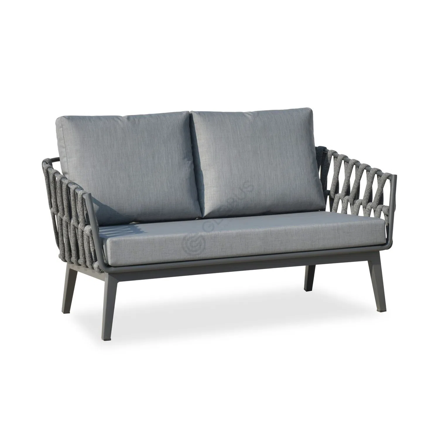 This armchair offers a sophisticated blend of contemporary design and tactile luxury. It features a sleek, durable aluminum frame that provides a clean, modern structure. The sides and back are detailed with a distinctive braided ribbon, adding texture and visual interest, creating an open yet supportive feel.