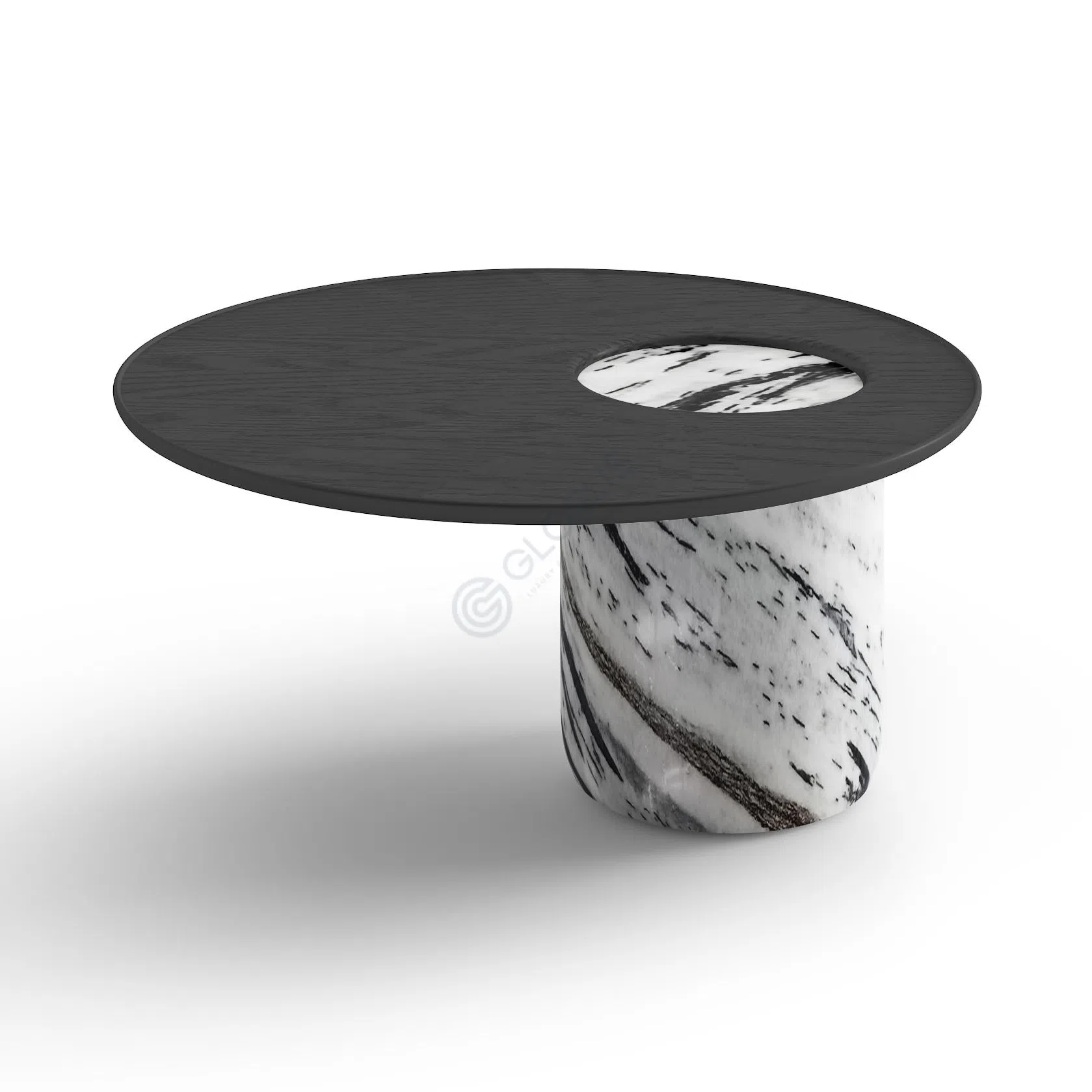 A distinctive element of this table is the precisely cut circular opening in the wood top. This thoughtful detail allows the captivating natural pattern of the marble base to be visible, integrating the two materials not just structurally, but also visually. It adds an unexpected touch that elevates the design beyond a simple two-part construction.