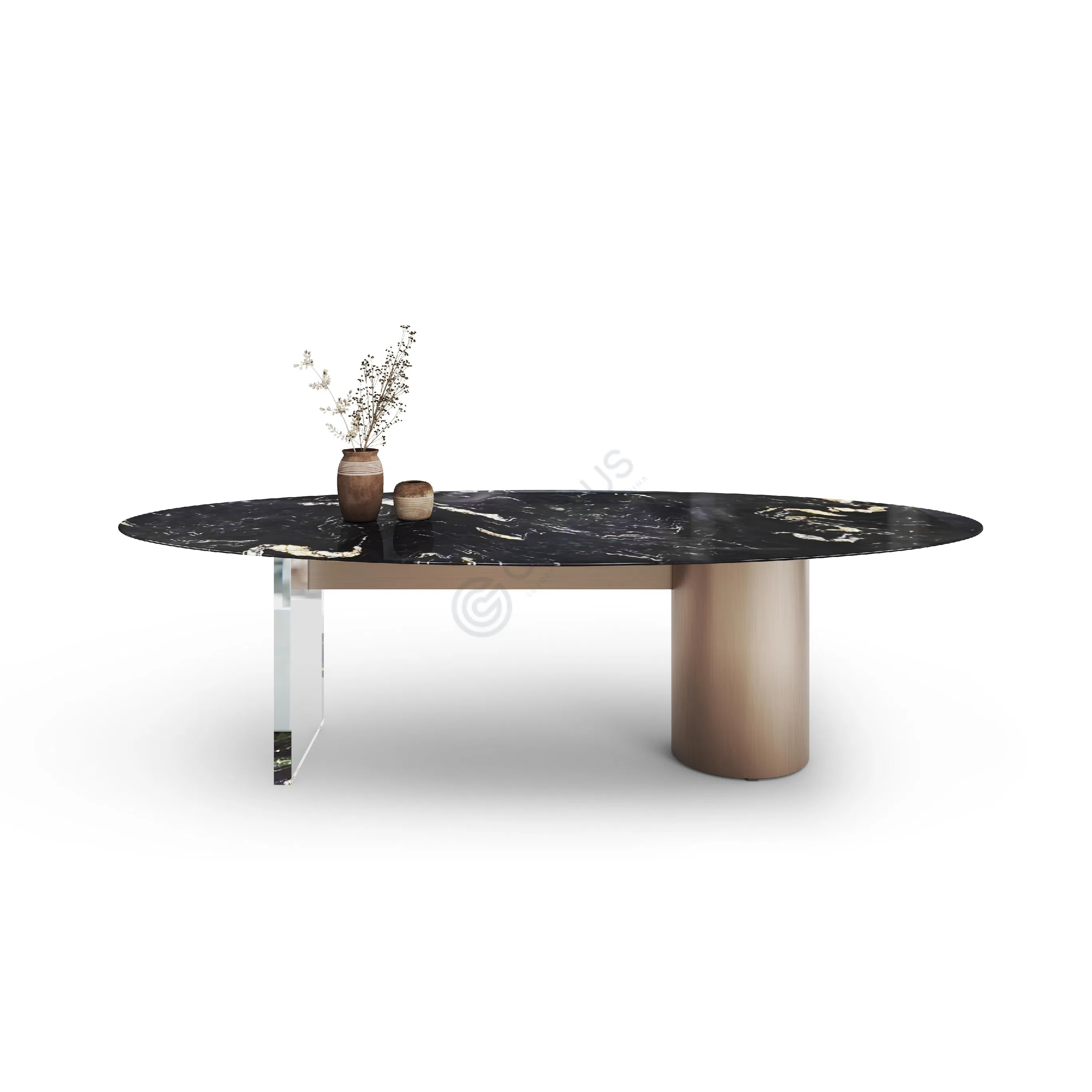The supporting base is a modern composition of contrasting forms and materials. One substantial cylindrical leg provides a solid anchor, finished in a warm, brushed metallic tone. This is complemented by a clear, geometric support element, subtly reflecting light and adding a touch of contemporary lightness. The combination of these elements creates a balanced yet distinctive structure.