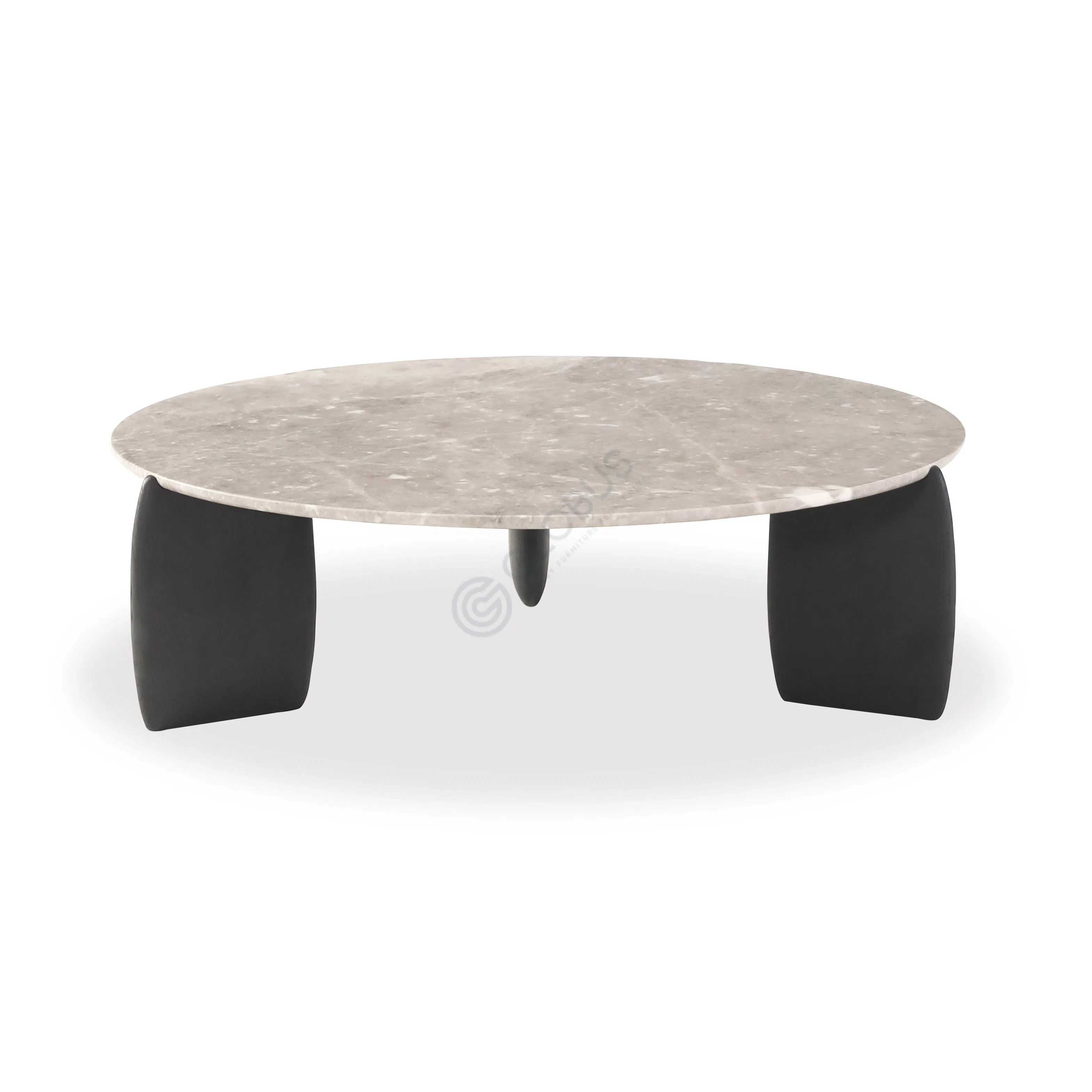 A modern side table featuring a striking natural marble top. The circular stone surface displays unique patterns and tones inherent to the material, offering individual character to each piece.