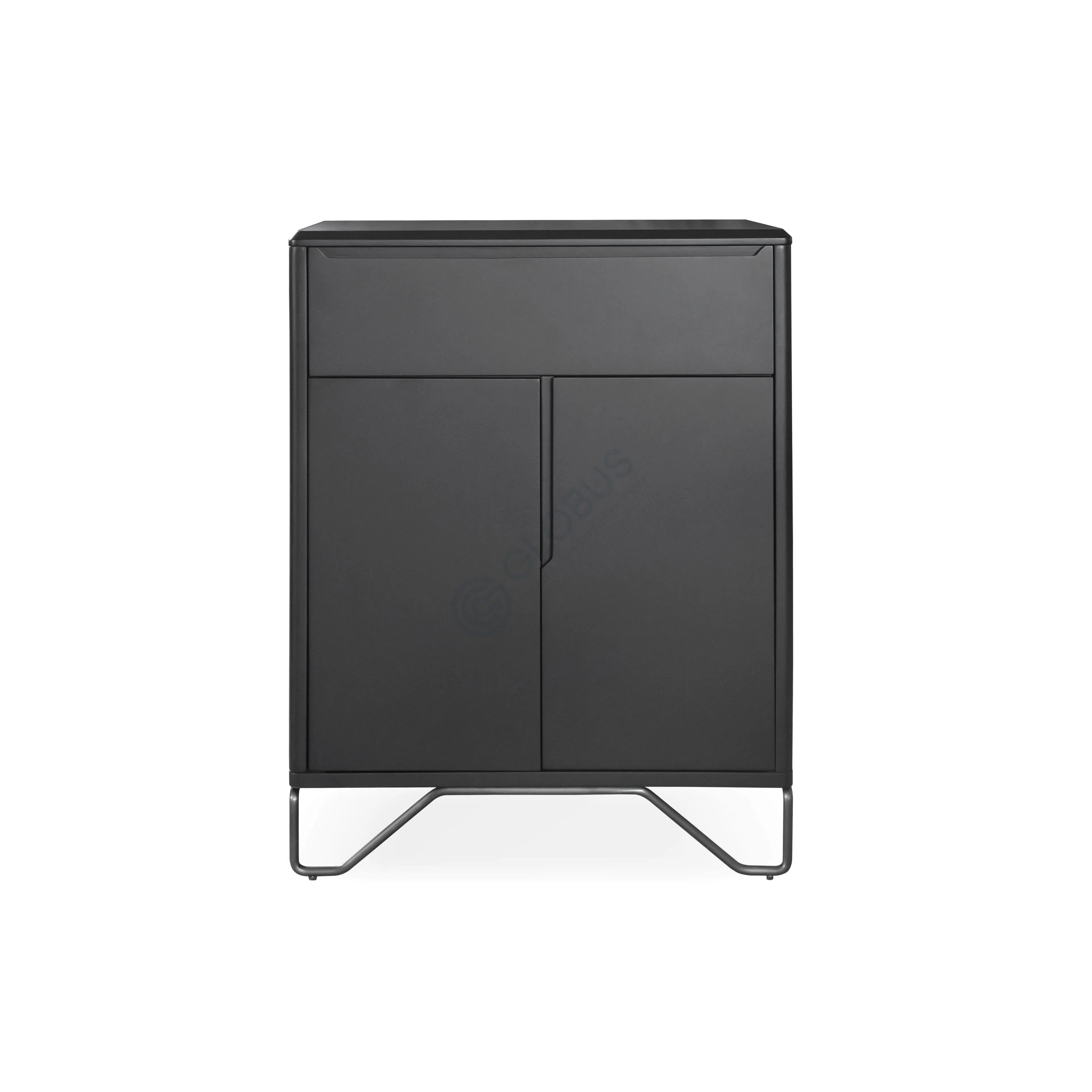 Constructed using quality materials, the cabinet combines solid wood and plywood for durability and a substantial feel. It is supported by a distinctive metal base with slender legs that provide stability while enhancing the modern, elevated look.