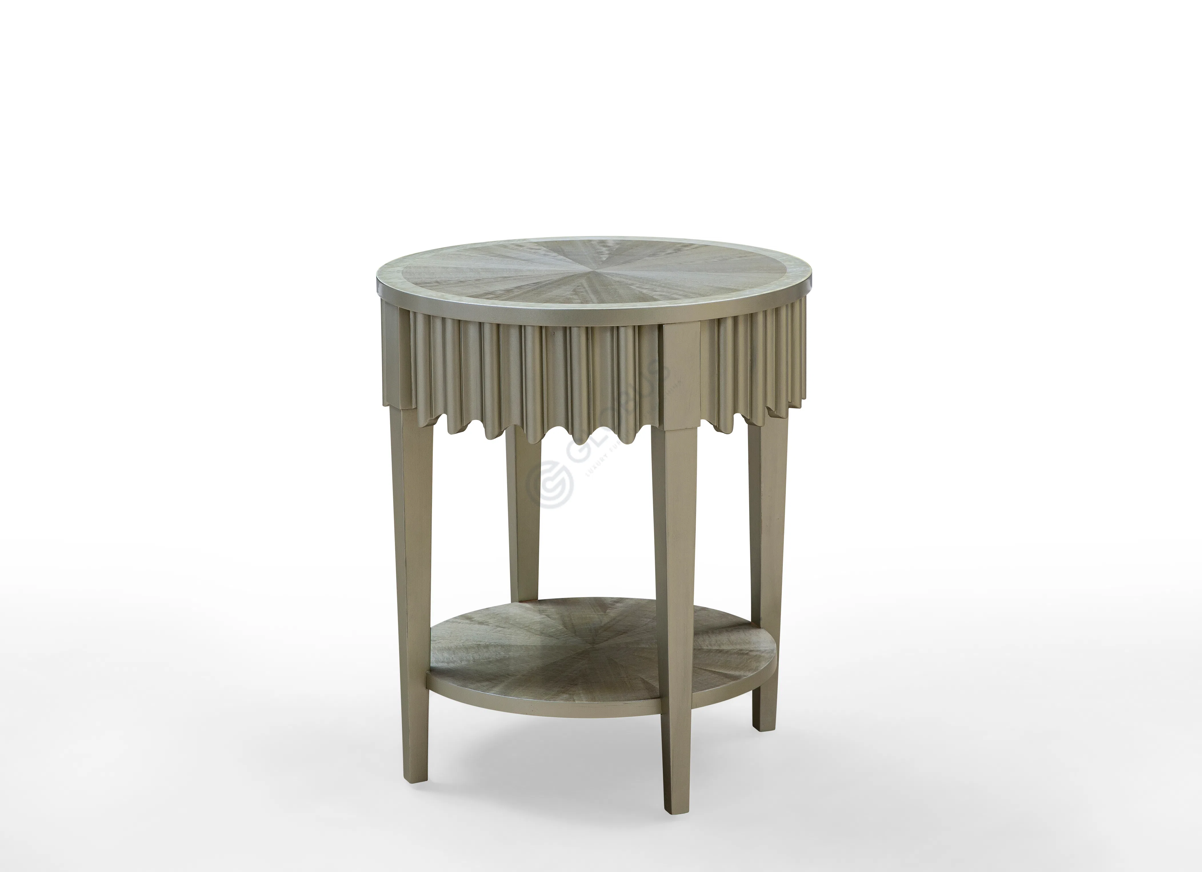 A round coffee table with a refined neo-classic character. The circular top shows a sunburst pattern in natural veneer framed by a slim border, set above a fluted apron with a gentle scalloped edge. Four tapered legs keep the silhouette light and well balanced for the living room.