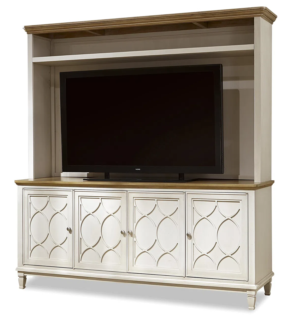 Each of the four doors features a distinctive decorative panel, intricately designed with interlocking geometric patterns that echo classic architectural motifs. These details elevate the piece beyond simple utility, showcasing careful craftsmanship. The subtle, understated hardware complements the overall design, allowing the textured door panels to stand out. Constructed from a thoughtful blend of solid wood, natural veneer, and MDF, this TV stand offers both stability and a smooth, luxurious surface finish, ensuring lasting beauty.