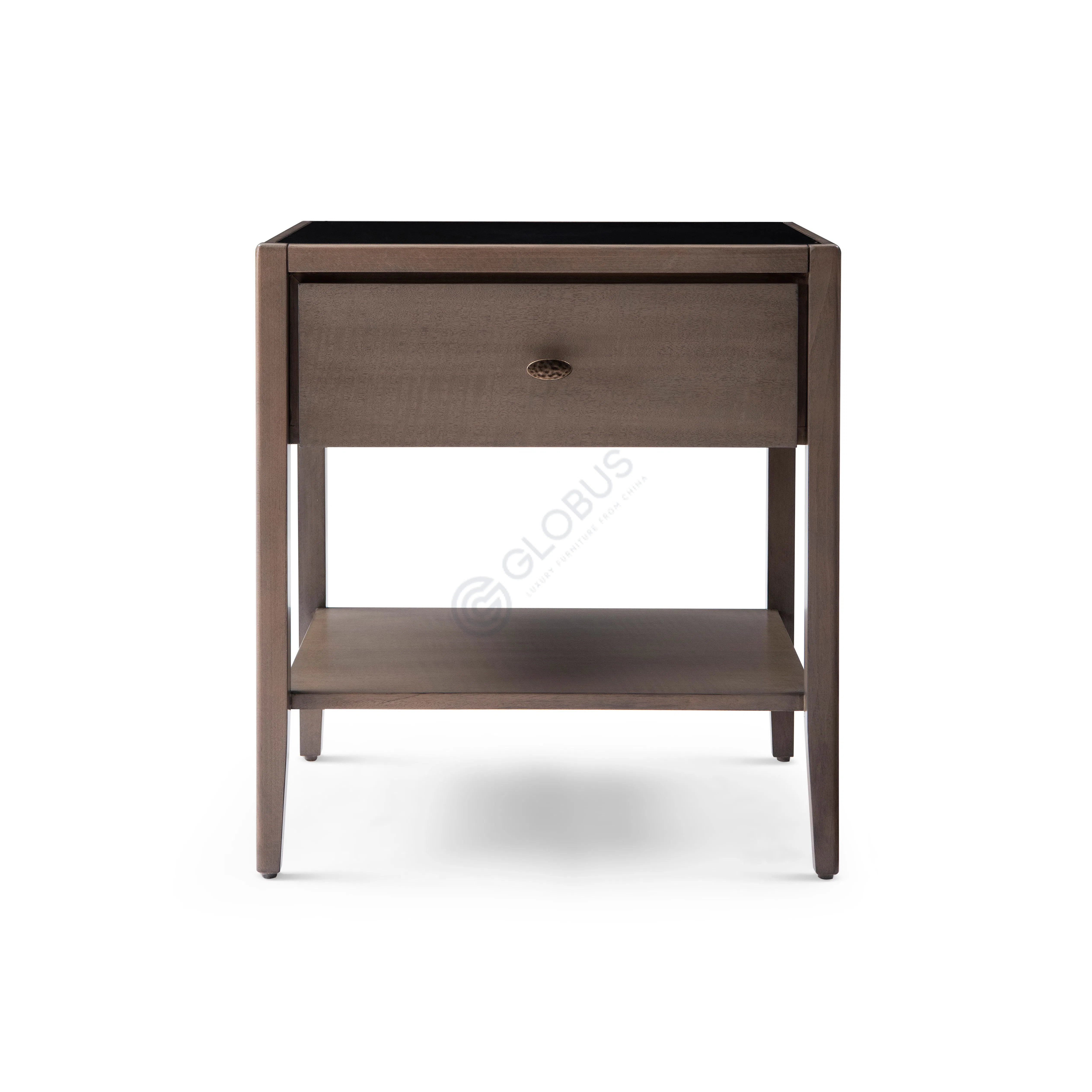 A modern bedside table with a clean silhouette, slender legs, and an inset tempered-glass top. The warm natural veneer shows a soft grain, while a discreet stainless‑steel knob brings a refined accent to the flush drawer front.