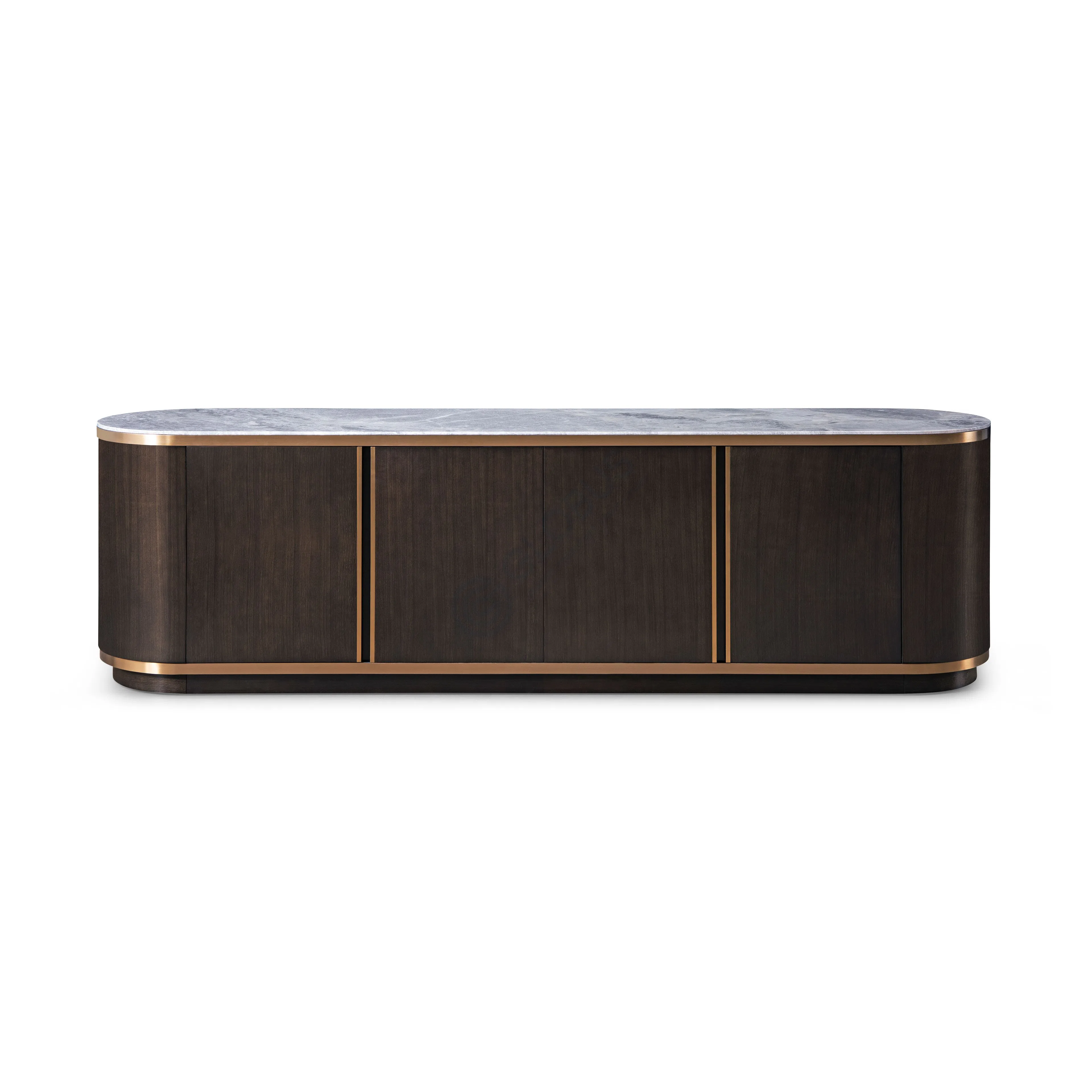 This elegant cabinet presents a refined profile, featuring beautifully rounded ends and a substantial top crafted from natural marble. Its facade is finished in a rich, dark natural wood veneer, creating a sense of warmth and depth. The design is subtly accented by vertical and horizontal lines of stainless steel, adding a touch of modern geometry against the classic form.
