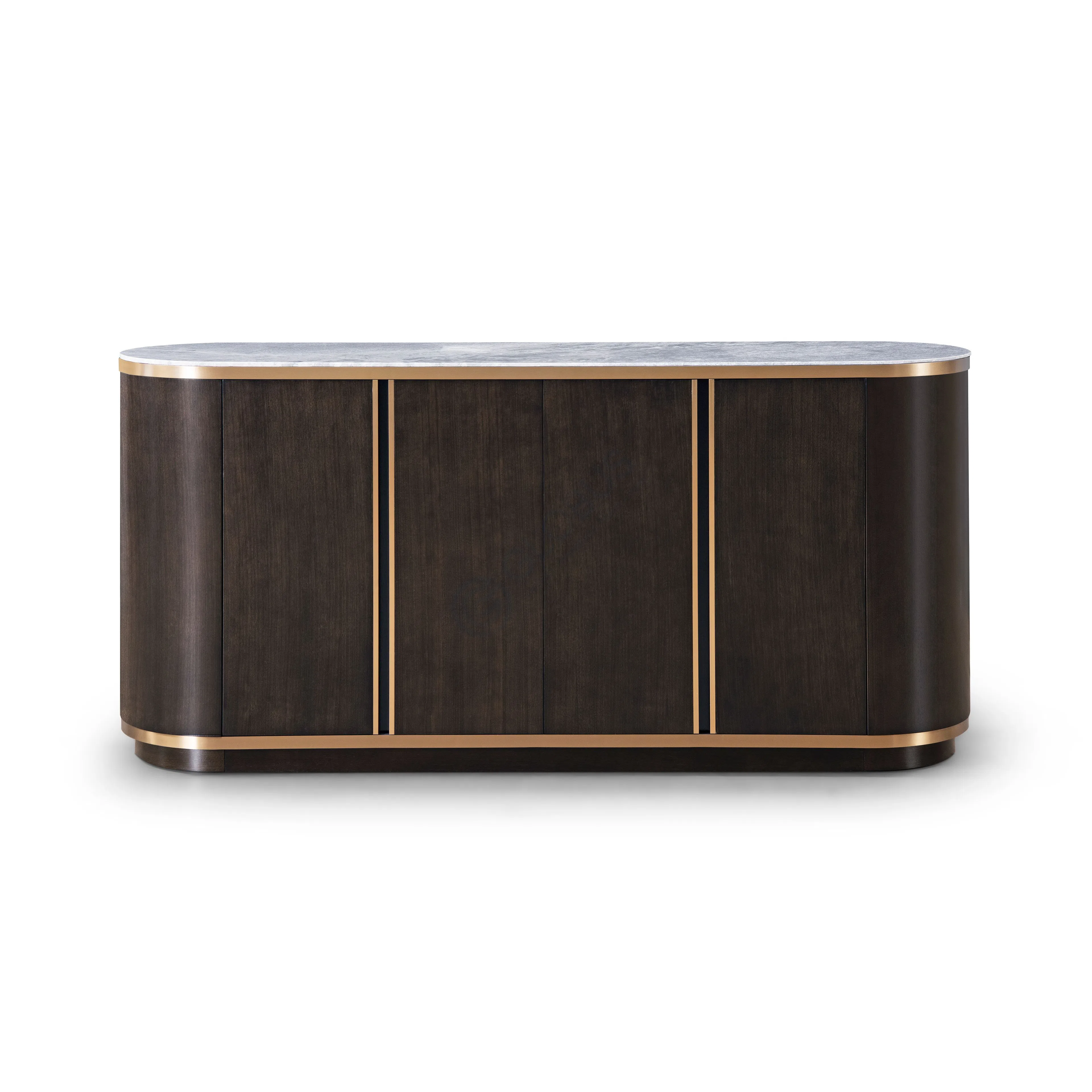 This elegant television stand presents a graceful, elongated silhouette with beautifully rounded edges that soften its substantial presence. The top surface features a slab of natural marble, its unique veining creating a distinct pattern that speaks of timeless luxury. Below, the body is clad in rich natural veneer, showcasing the inherent warmth and grain of the wood, providing a sophisticated contrast to the cool marble.