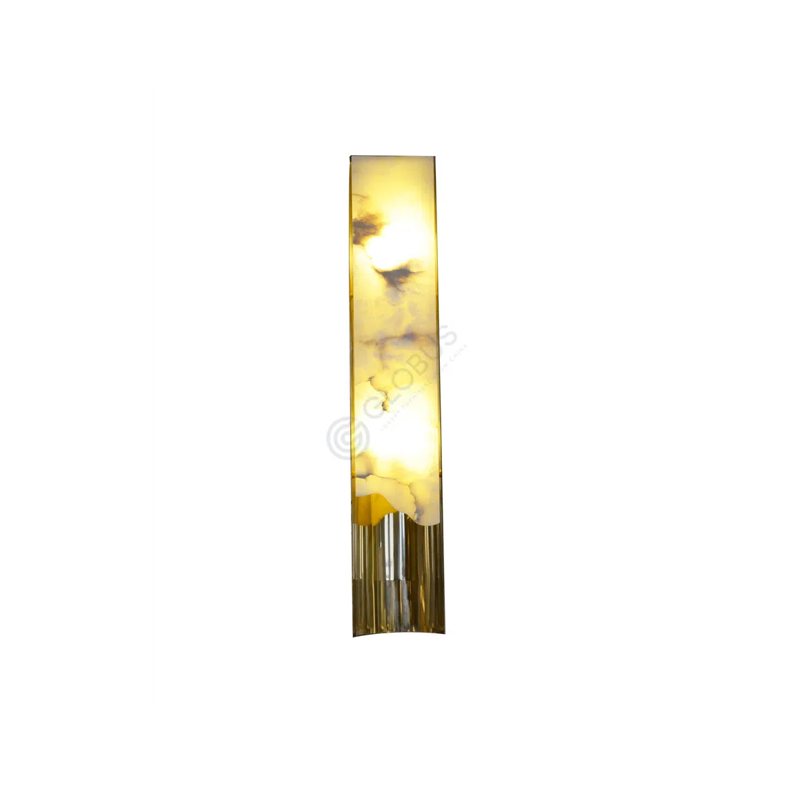 This elegant lighting piece is constructed using polished stainless steel and segments of natural stone. The reflective quality of the stainless steel contrasts beautifully with the organic patterns and subtle translucence of the stone, creating an interplay of light and texture that gives the fixture a unique presence.