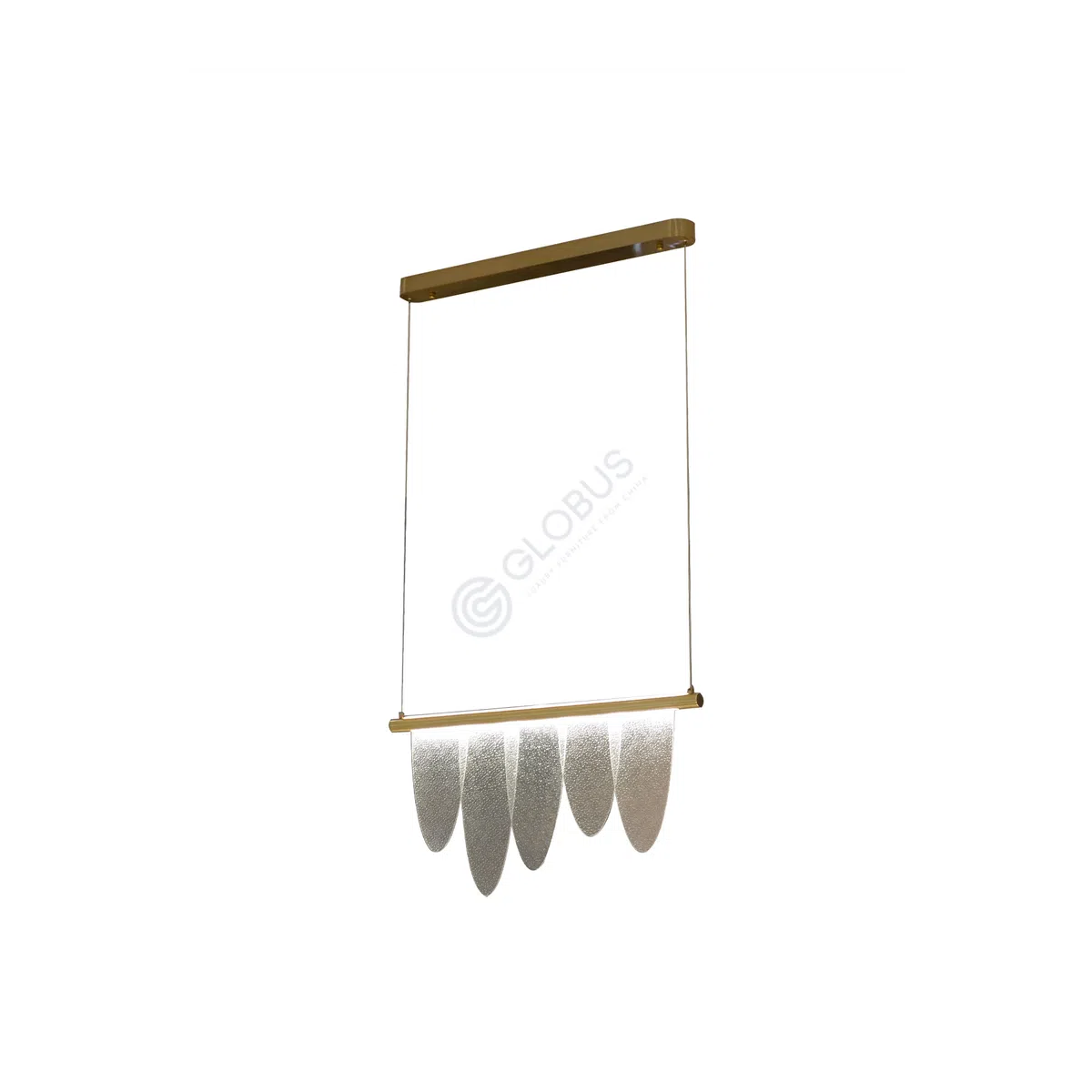 This wall lamp presents a striking modern design, featuring a series of delicate, frosted glass panels suspended from a sleek metallic bar. The panels have a unique, organic shape, resembling stylized petals or feathers, which creates a gentle, layered visual effect. When illuminated, the light diffuses softly through the textured glass, casting a warm and inviting glow. The minimalist structure allows the beauty of the materials and the quality of the light to take center stage.