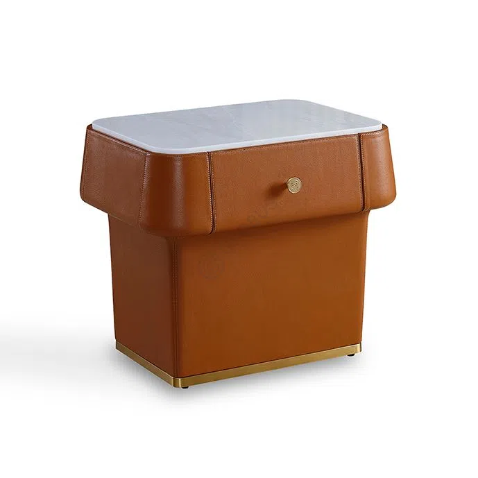 This modern bed features a sleek profile wrapped entirely in luxurious leather. The rich caramel tone of the leather upholstery adds warmth and sophistication to any bedroom setting. Its clean lines and low-profile design embody contemporary elegance.