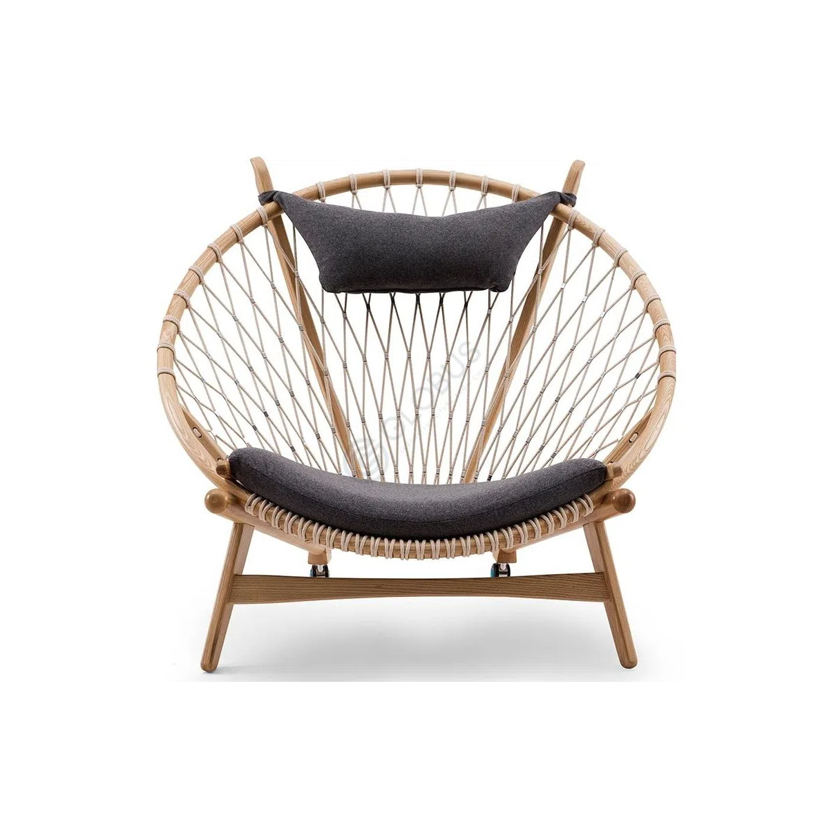 Crafted from solid wood, the frame provides a sturdy yet elegant foundation. The back and sides feature intricate rope weaving, adding a touch of handcrafted artistry and visual lightness. Complementing this structure are soft textile cushions for the seat and headrest, designed for comfort.