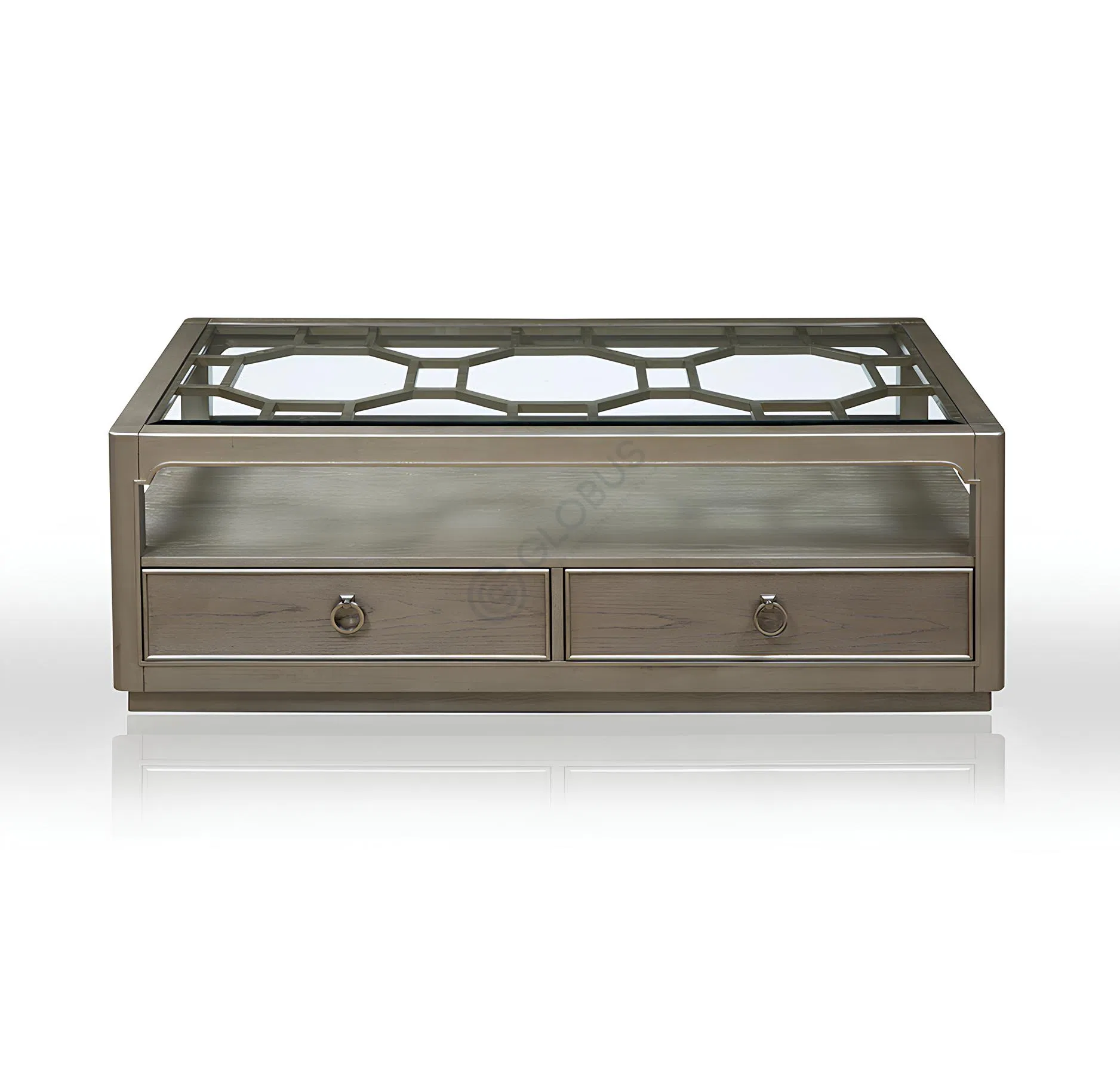 Crafted with a foundation of solid wood, natural veneer, and MDF, the table offers both durability and a luxurious finish. The top surface features a clear tempered glass panel, beneath which an intricate geometric pattern is beautifully displayed. A secondary tempered glass shelf provides additional space, complemented by a solid bottom shelf that mirrors the table’s cohesive base.