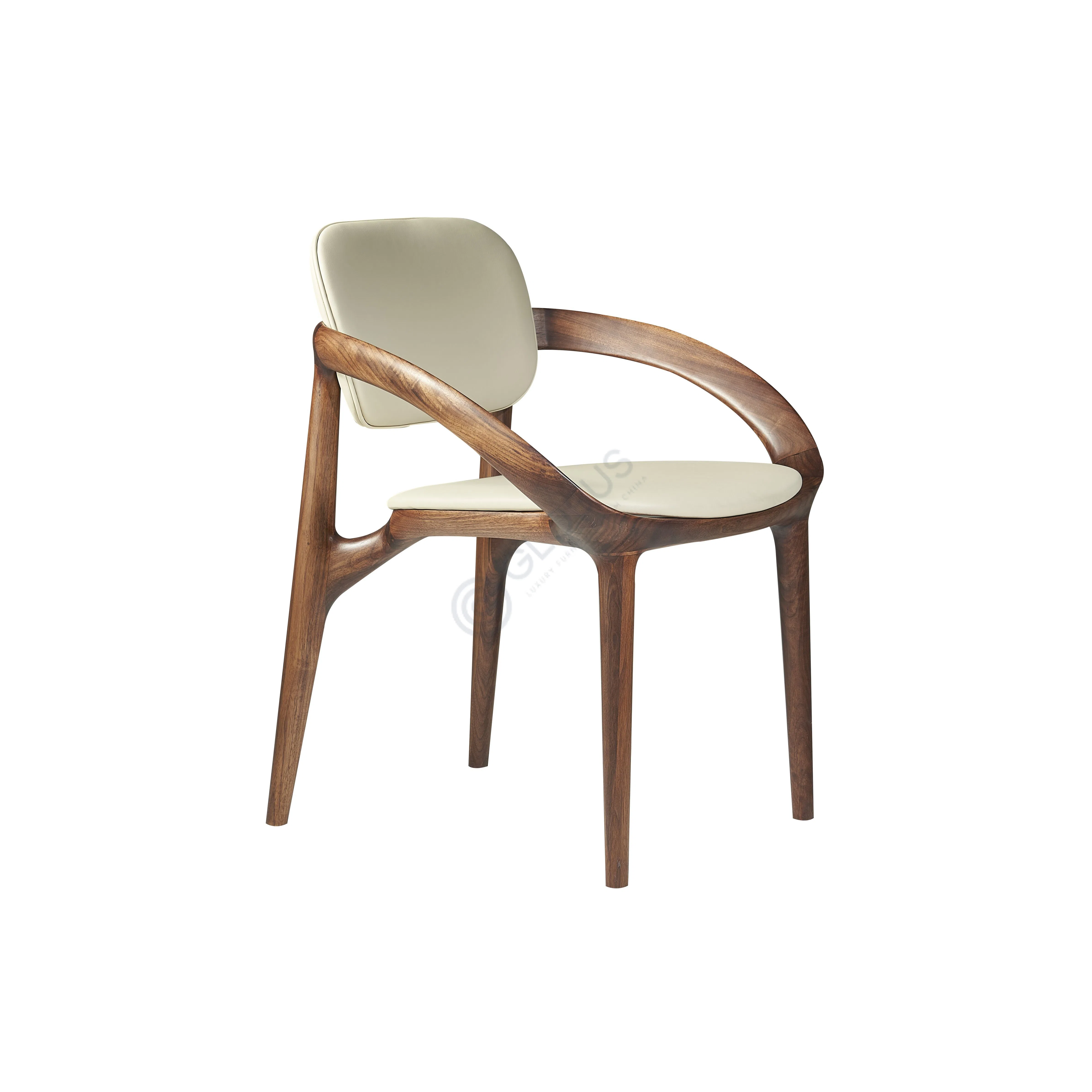 This dining chair presents a harmonious blend of form and material. Crafted from solid wood, its frame showcases graceful, organic curves that flow seamlessly, creating a sense of movement and natural elegance. The design speaks to a contemporary sensibility while subtly incorporating the simplicity and natural beauty found in Wabi-sabi and Asian aesthetics. The thoughtful curvature of the back and armrest offers comfortable support.