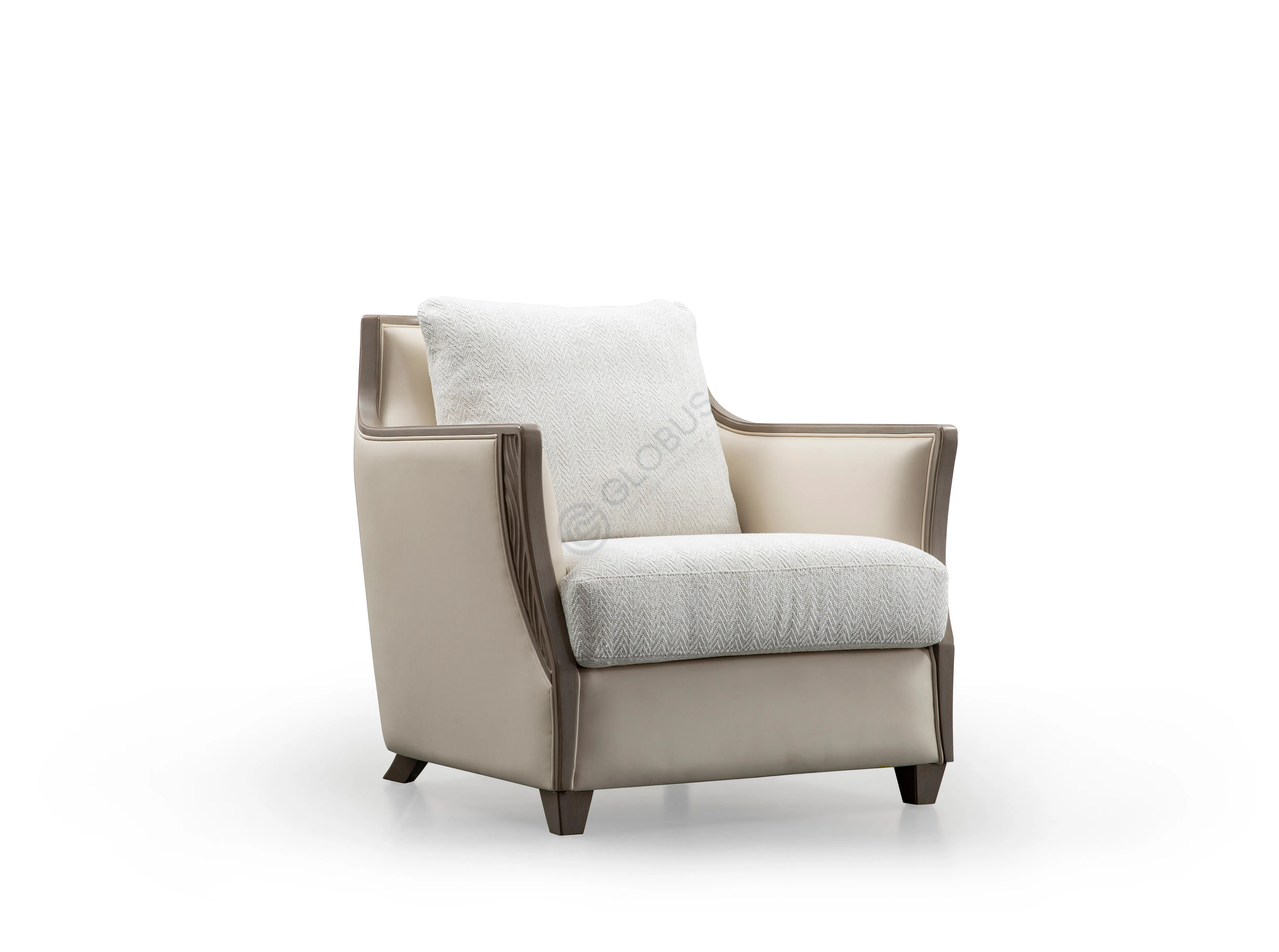 The structure is crafted from solid wood for stability, while the tailored cushions offer balanced support and comfortable depth. Loose back pillows encourage an easy, relaxed sit without sacrificing posture.