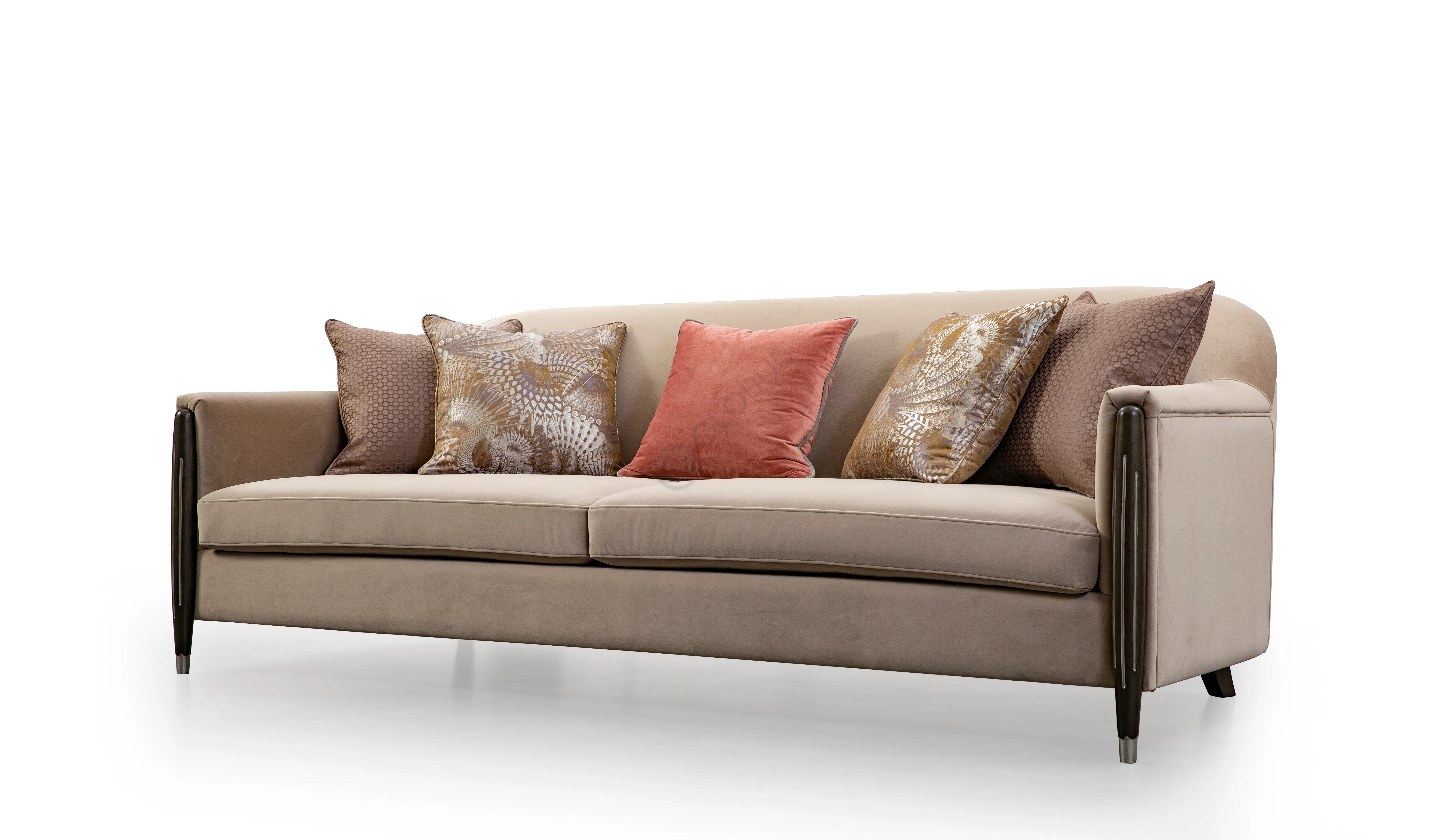 A neo-classic armchair with a rounded back and streamlined arms, wrapped in a soft sand-toned textile. Dark, hand-finished solid wood panels run along the sides and continue to tapered legs with subtle metal caps, giving the silhouette structure and balance. A patterned accent cushion brings a gentle sheen and a touch of detail.