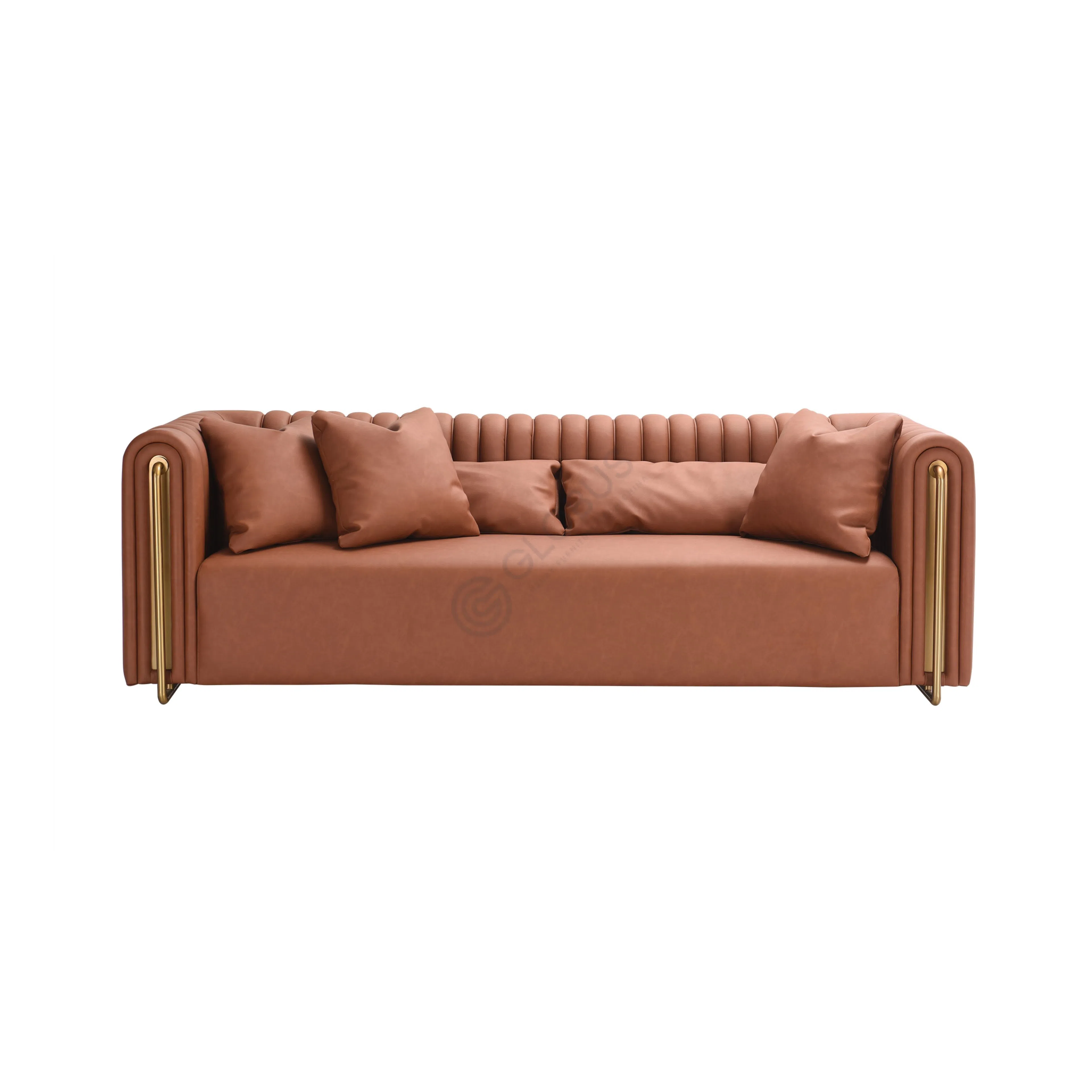 The armchair is supported by a sturdy base crafted from solid wood and plywood, harmoniously blending traditional craftsmanship with contemporary style. Polished metal accents frame the armrests, adding a touch of refinement and creating a striking visual contrast.