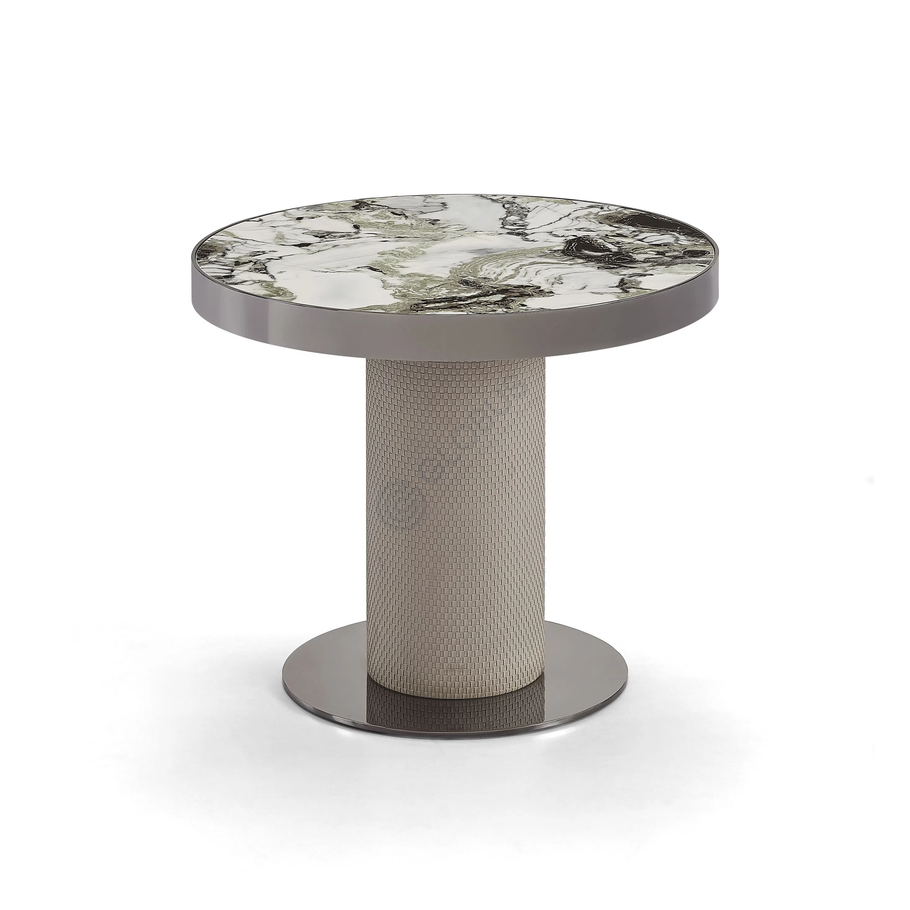 A circular coffee table combines a sintered stone top with a subtle veining of greens and grays, set within a polished stainless steel rim. Beneath the surface, a cylindrical column upholstered in soft leather rises from a matching stainless steel base, creating a balanced composition of textures and finishes.