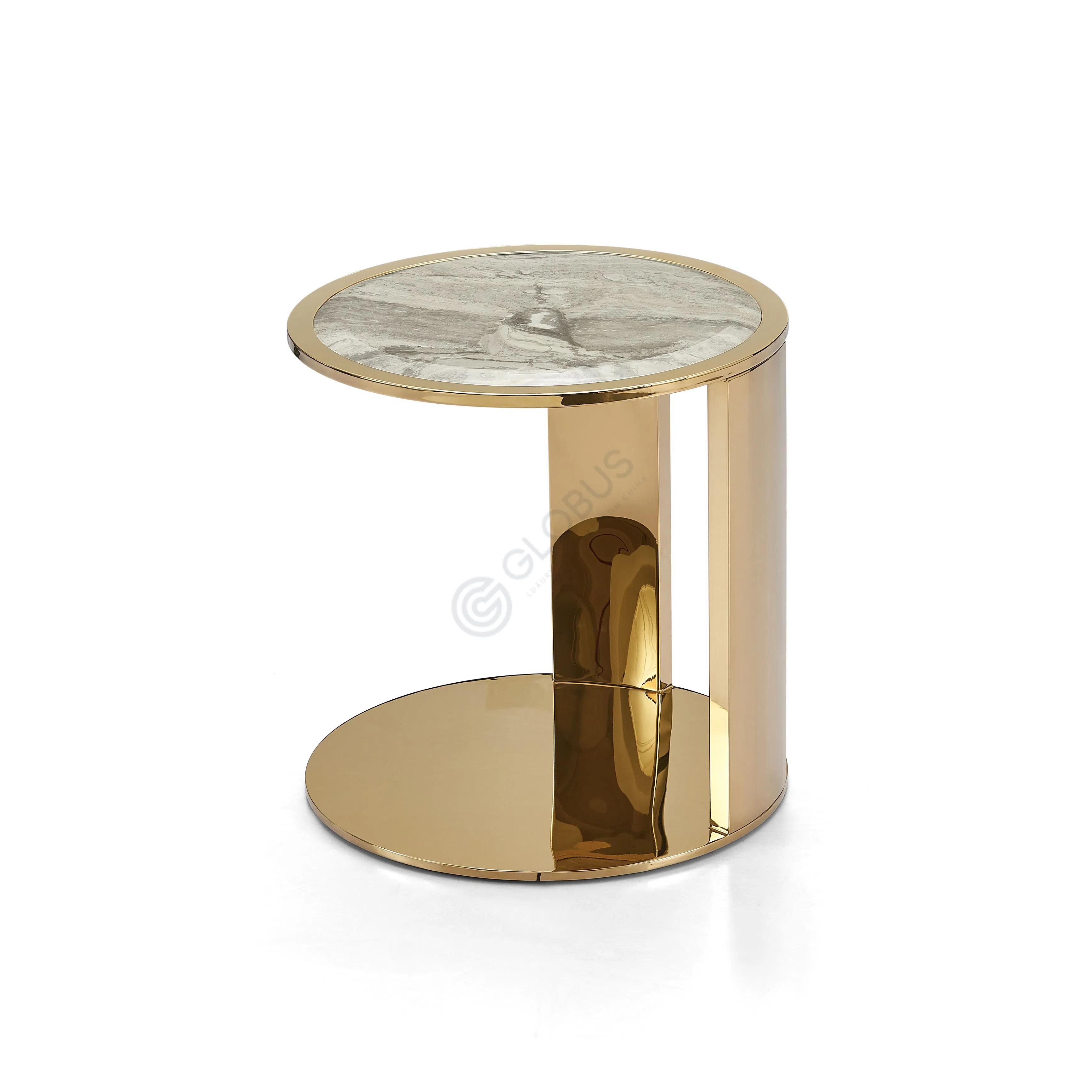 Each top is crafted from natural marble, its soft white surface marked by distinct gray veining. The stainless steel bases are finished in a warm gold tone, creating a polished contrast that catches the light without overpowering the room.
