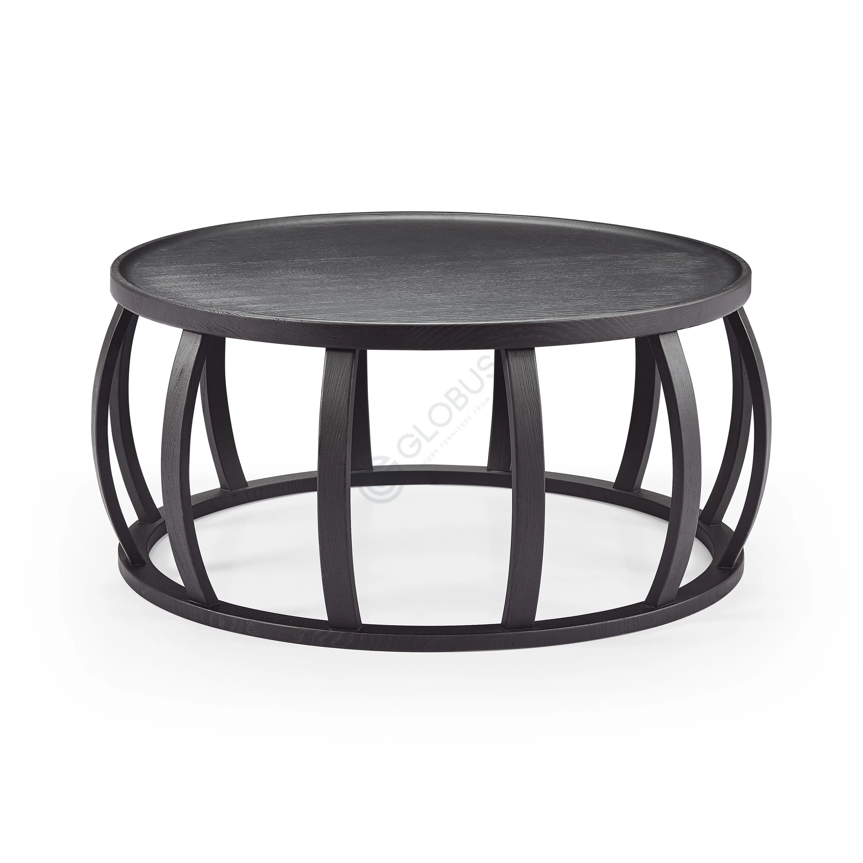 The table's circular top is balanced by a unique open-frame base consisting of curved wooden slats. This design adds a contemporary, airy touch to the room, creating a sense of openness while maintaining a clean and organized aesthetic.